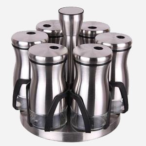 این محصول شامل 8 ظرف استیل به همراه یک استند فلزی است. استیل استفاده شده در این محصول ضد زنگ بوده و از کیفیت بالایی برخوردار است. قسمت شیشه ای پایین این ظروف به دیدن شدن ادویه موجود در آن کمک میکند. درب این ظروف دارای سوراخ هایی برای پاشیدن ادویه است که با چرخاندن سر پوش روی آن ها بسته می شوند.