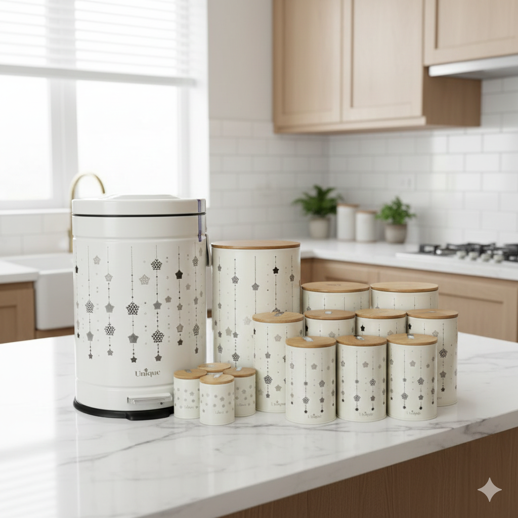 سرویس آشپزخانه 15 پارچه مدل کرم ستاره آویز درب بامبو یونیک 8014