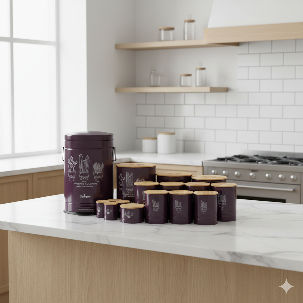 خرید سرویس های آشپزخانه راحت ترین راه برای تامین ظرف های آشپزخانه است. سرویس آشپزخانه 16پارچه یونیک الیزابت 9087 بادمجانی شامل قوطی های فلزی بسیار با کیفیتی است که در اندازه های مختلف تولید شده اند. میتوانید از این قوطی ها برای نگهداری مواد غذایی مختلف استفاده کنید. برای مثال حبوبات، نمک، برنج، قند و شکر، ادویه جات و … . همچنین این سرویس دارای یک سطل زباله بزرگ است. این سطل هم از یک بدنه فلزی و یک سطل داخلی قابل جدا شدن از جنس پلاستیک تشکیل شده تا شستشو ی آن آسان باشد. سطل داخلی دارای یک دسته استیل است و به راحتی بیرون می آید. برای باز کردن درب این سطل یک پدال در نظر گرفته شده و درب آن به صورت آرام بسته میشود.