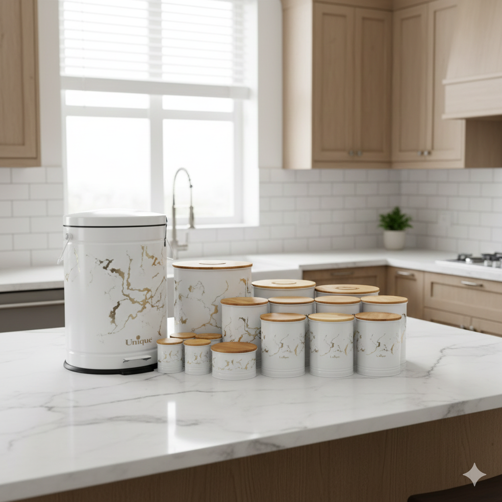 با وجود صد ها مدل مختلف از ابزار و وسایل آشپزخانه بسیاری از افراد در انتخاب بین آن ها دچار سردرگمی میشوند. خرید سرویس های کامل به صورت یکجا علاوه بر حل این مشکل باعث صرفه جویی در وقت شما میشود. سرویس های آشپزخانه یونیک، برای هر طرح از محصولات آن در تعداد متفاوتی از جمله 8 پارچه، 25 پارچه و … عرضه میشوند تا پاسخگوی نیاز هر خانه ای باشد. سرویس آشپزخانه 16 پارچه مدل سفید الیزابت ماربل طلایی یونیک 9024 شامل مواد زیر است:
