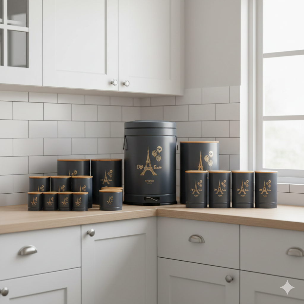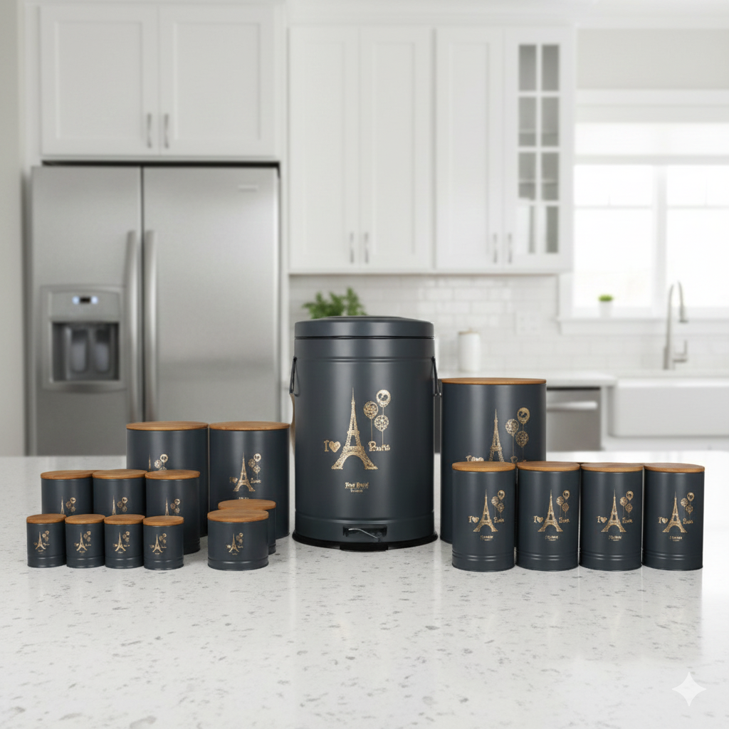 “سرویس آشپزخانه 17 پارچه نیوهوم مدل ایفل بامبو کد NH13-1401-GR” یک سرویس آشپزخانه کامل برای خانه شماست. شاید انتخاب تک تک بانکه ها و سطل ها کار دشواری باشد و در نهایت ست آشپزخانه شما با هم جور نشود به این خاطر ترکیب بانکه ها و جا ادویه ها در یک پک، کار شما را راحت تر میکند. اما با خرید ست 17 پارچه نیوهوم نیاز بر طرف میشود. این محصول ساخته شده از فلز آبکاری شده با کیفیت است که دارای طرح و رنگبندی متنوع دارد ، همچنین محفظه داخلی بانکه کیفیت خوبی دارند و از بو گرفتن و خراب شدن مواد غذایی جلوگیری میکند. این سرویس شامل اقلام زیر میباشند: