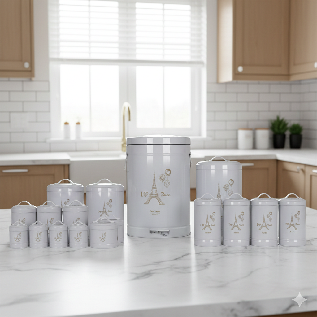 “سرویس آشپزخانه 17 پارچه نیوهوم مدل ایفل کد NH13-1301IN” یک سرویس آشپزخانه کامل برای خانه شماست. شاید انتخاب تک تک بانکه ها و سطل ها کار دشواری باشد و در نهایت ست آشپزخانه شما با هم جور نشود به این خاطر ترکیب بانکه ها و جا ادویه ها در یک پک، کار شما را راحت تر میکند. اما با خرید ست 17 پارچه نیوهوم نیاز بر طرف میشود. این محصول ساخته شده از فلز آبکاری شده با کیفیت است که دارای طرح و رنگبندی متنوع دارد ، همچنین محفظه داخلی بانکه کیفیت خوبی دارند و از بو گرفتن و خراب شدن مواد غذایی جلوگیری میکند. این سرویس شامل اقلام زیر میباشند: