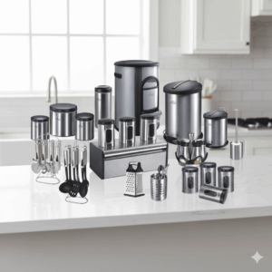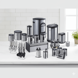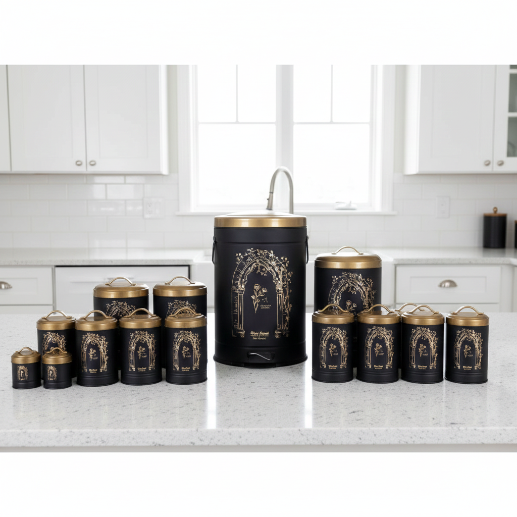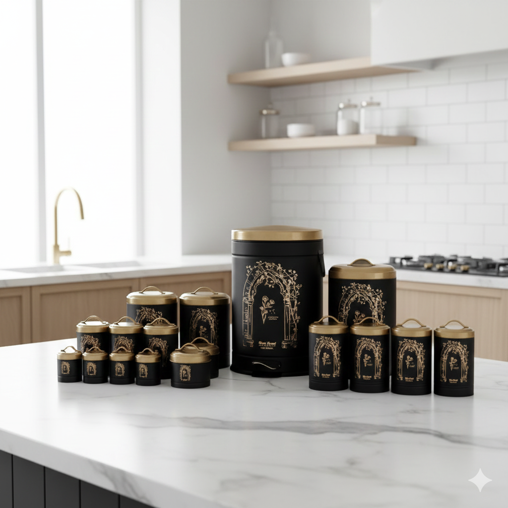 “سرویس آشپزخانه 17 پارچه نیوهوم مدل طاق کسری کد NH13-1303B” یک سرویس آشپزخانه کامل برای خانه شماست. شاید انتخاب تک تک بانکه ها و سطل ها کار دشواری باشد و در نهایت ست آشپزخانه شما با هم جور نشود به این خاطر ترکیب بانکه ها و جا ادویه ها در یک پک، کار شما را راحت تر میکند. اما با خرید ست 17 پارچه نیوهوم نیاز بر طرف میشود. این محصول ساخته شده از فلز آبکاری شده با کیفیت است که دارای طرح و رنگبندی متنوع دارد ، همچنین محفظه داخلی بانکه کیفیت خوبی دارند و از بو گرفتن و خراب شدن مواد غذایی جلوگیری میکند. این سرویس شامل اقلام زیر میباشند: