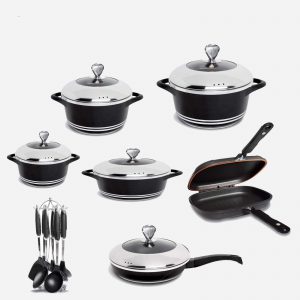 با افتخار، به شما این سرویس را معرفی میکنیم. رنگ مشکی شیک و الگوی خاص این سرویس، زیبایی و شکوهی خاص را به اشپزخانهی شما میبخشد. هر قطعه از این سرویس با طراحی دقیق و ظرافتی خاص تولید شده است.