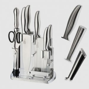 دستههای ارگونومیک این کاردها، استفاده طولانیمدت بدون خستگی را فراهم میکنند و پایه نگهدارنده شیک و چرخان آن، علاوه بر زیبایی، دسترسی سریع به ابزارها را در حین آشپزی آسان میسازد.