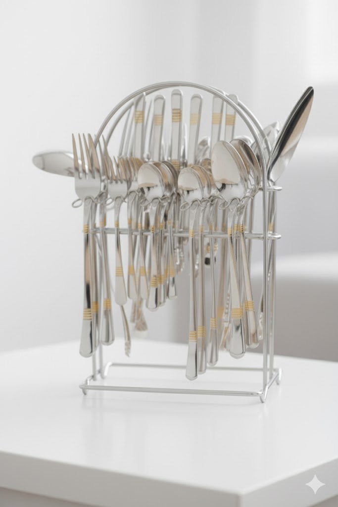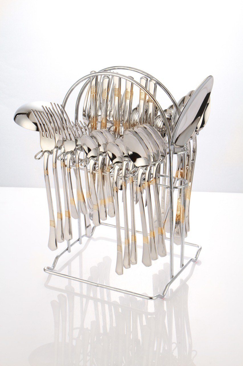 - شامل 39 قطعه: 6 عدد قاشق غذا خوری 6 عدد چنگال غذا خوری 6 عدد کارد میوه خوری 6 عدد چنگال میوه خوری 6 عدد قاشق چایی 6 عدد قاشق شربت و 1 عدد کفگیر و 1 عدد ملاقه و استند