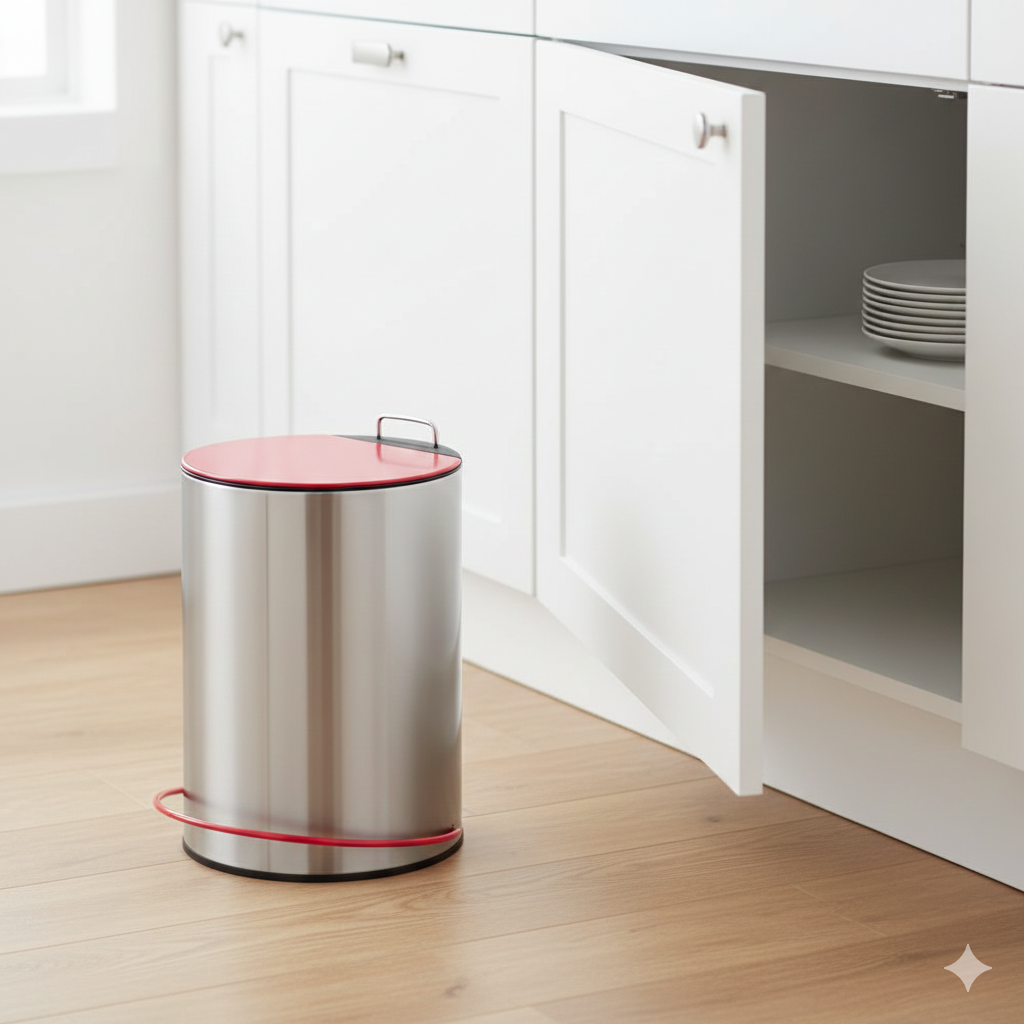 این سطل دارای بدنه ای از استیل ضد زنگ است. استیل به دلیل مقاومت زیاد و سطح صاف و یکدست به راحتی قابل شستشو و ضد عفونی کردن است. طراحی این سطل بسیار ساده و مدرن بوده که باعث میشود با هر دکوراسیونی همخوانی داشته باشد. این سطل دارای یک پدال بوده تا با فشار دادن آن بتوانید بدون نیاز به دست زدن به سطل درب آنرا باز کنید. همچنی برای حمل آسان تر یک دسته فلزی در بالای سطل نصب شده.