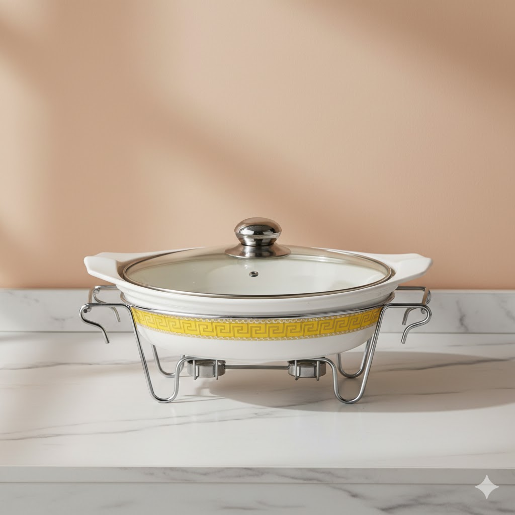 “سوفله خوری چینی بزرگ یونیک کد 8567” ساخته شده از سه قسمت مجزا است. ظرف از جنس چینی در داخل برای قرار دادن غذا. دستگیره درب و وارمر از جنس استیل ضد زنگ درجه یک. و درب شیشه ای. مناسب برای سرو انواع غذا به صورت سرد و گرم. زیر این ظرف دو جا شمعی تعبیه شده و گرمای کافی برای گرم نگه داشتن انواع غذا ها را تامین میکند. بدنه شیار دار و دسته های زیبای این محصول ظاهری بسیار زیبا و مناسب مهمانی ها یا استفاده روزمره دارد.