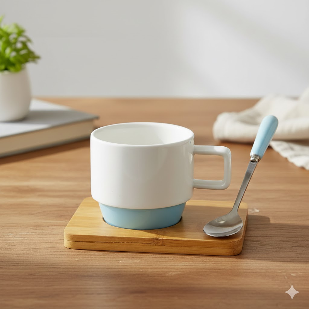 فنجان سرامیکی و زیرلیوان بامبو و قاشق