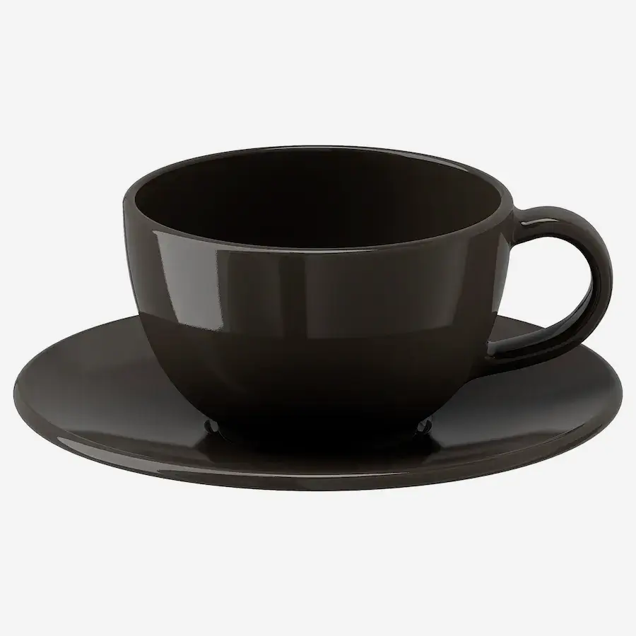 فنجان نعلبکی ایکیا IKEA-VARDAGEN با طراحی ساده، شکل های گرد و منحنی، یک محصول خاص و زیبا است. جنس این قهوه خوری از سرامیک است که با لعاب مشکی رنگ پوشیده شده است.