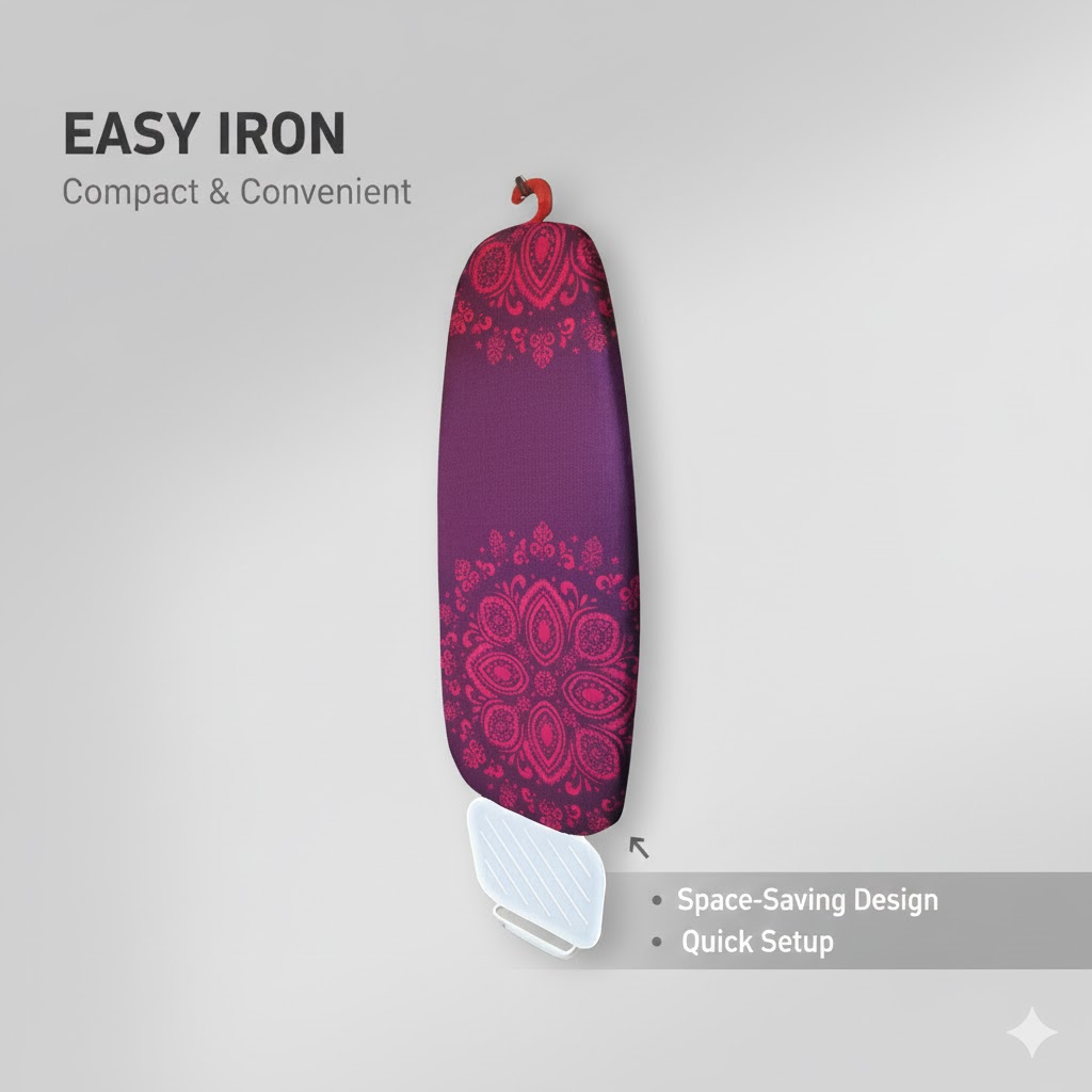 صفحه زیرین این میز مشبک است و اجازه در شدن بخار را میدههد تا سطح میز خیس نشود. این صفحه با یک اسفنج و روکش پارچه ای پوشیده شده تا اتو زدن را هر چه بیشتر راحت کند. صفحه کناری میز فلزی و برای قرار دادن اتو است. برای اینکه به راحتی بتوانید این میز را در کمد یا کنار دیوار قرار دهید یک قلاب برای آن تعبیه شده.