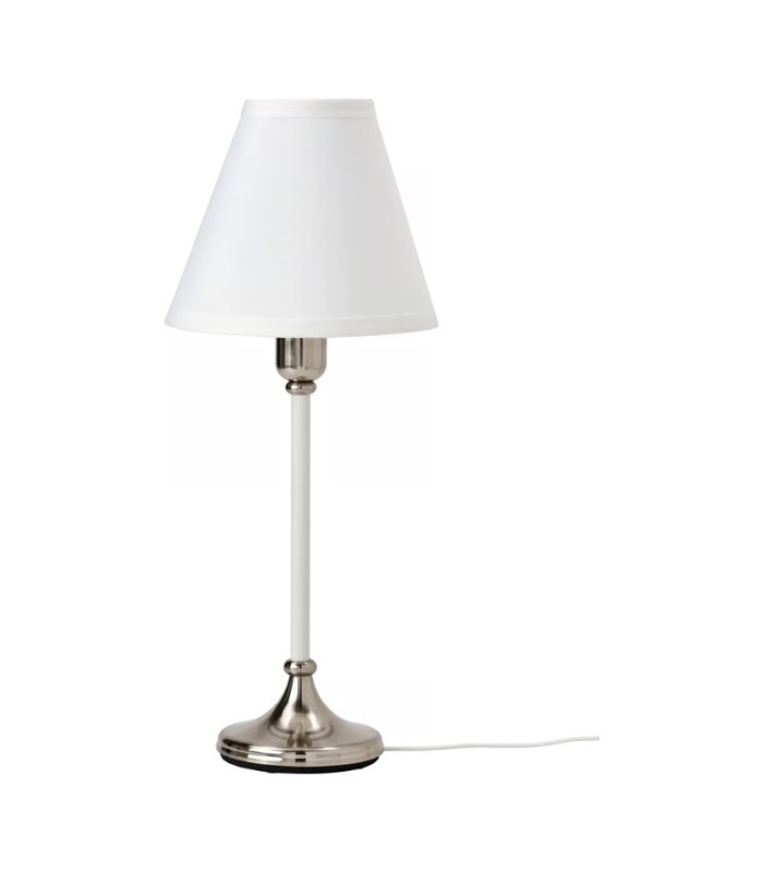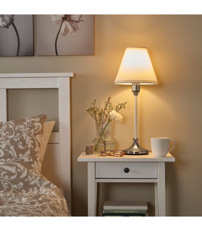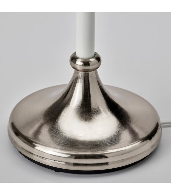 آباژور رو میزی ایکیا مدل FLYGHÖJD را متمایز میکند، طراحی کلاسیک و جذاب آن است که به طرز شگفتآوری با دکوراسیونهای سنتی و مدرن هماهنگ میشود. ترکیب رنگ نیکل-پلاکت (پایه فلزی براق) و سفید (کلاهک پارچهای) یک کنتراست ظریف و لوکس ایجاد کرده که جلوهای آرامشبخش و در عین حال شیک به میز کنار تخت، میز کار یا میز پذیرایی شما میبخشد. جزئیات ظریف در پایه استیل آن، حسی از کیفیت و دوام را القا میکند.