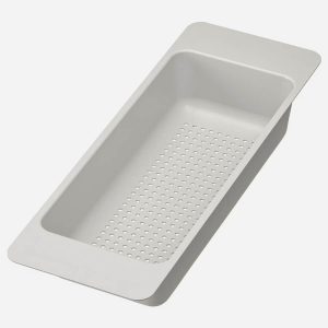آبکش استیل ایکیا IKEA-ORDNING از جنس استیل ضد زنگ است. از این رو مقاومت بسیار بالایی دارد. ارتفاع بلند و دهانه ی کوچکتر آن نسبت به آبکش های دسته دار معمولی باعث شده تا به راحتی در سینک جا بگیرد. دو دسته و یک پایه بلند نیز برای آن تعبیه شده که همه از جنس استیل ضد زنگ هستند.
