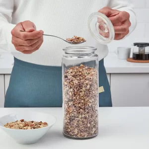 یکی از بهترین انتخاب ها برای نگهداری مواد غذایی ظروف شیشه ای هستند. شیشه ها به راحتی تمیز میشوند و به هیچ وجه با مواد غذایی واکنش نمیدهند. برای همین میتوان از سلامت آن اطمینان داشت. در انتخاب ظروف شیشه ای باید دقت کرد. چون در صورتی که شیشه از کیفیت بالایی برخوردار نباشد. ممکن است در صورت وارد شدن ضربه ای کوچک بشکند و علاوه بر خسارت شیشه مواد غذایی داخل آن هم غیر قابل استفاده شود. بانکه وارداگن 1.9 ایکیا IKEA-VARDAGEN دارای یک درب واشر دار است.