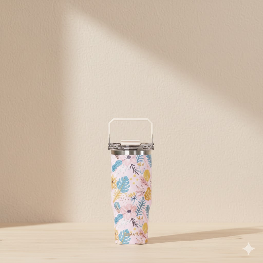 شش تراول ماگ با طراحی بدنه استوانهای بلند و باریک، به صورت افقی و در یک ردیف بر روی پسزمینهای محو و بافتدار به رنگ قهوهای روشن قرار گرفتهاند. هر فلاسک با نقوش برجسته و رنگارنگ گلهای سه بعدی تزئین شده است که جلوهای هنری و منحصربهفرد به آنها بخشیده است. تمامی فلاسکها دارای دربهای پیچی با دستگیرههای تاشو برای حمل آسان هستند.