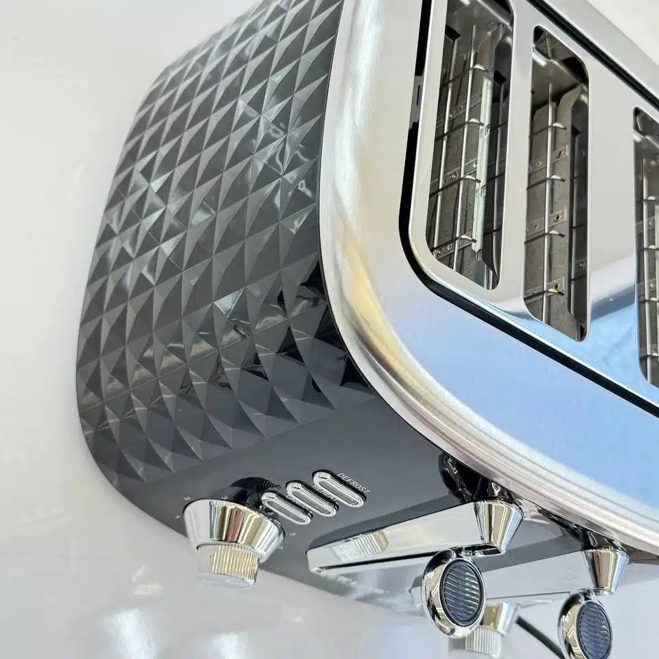 بدنه مشکی براق این تُستر با جزئیات نقرهای درخشان، ترکیبی چشمنواز از سبک رترو و مدرن را به نمایش میگذارد. انحناهای ملایم و طراحی جمع و جور آن، نه تنها فضای کمی را اشغال میکند، بلکه به هر دکوراسیونی جلوهای خاص و متمایز میبخشد. این تُستر، فراتر از یک وسیله کاربردی، یک عنصر دکوراتیو جذاب بر روی میز صبحانه یا کانتر آشپزخانه شما خواهد بود.