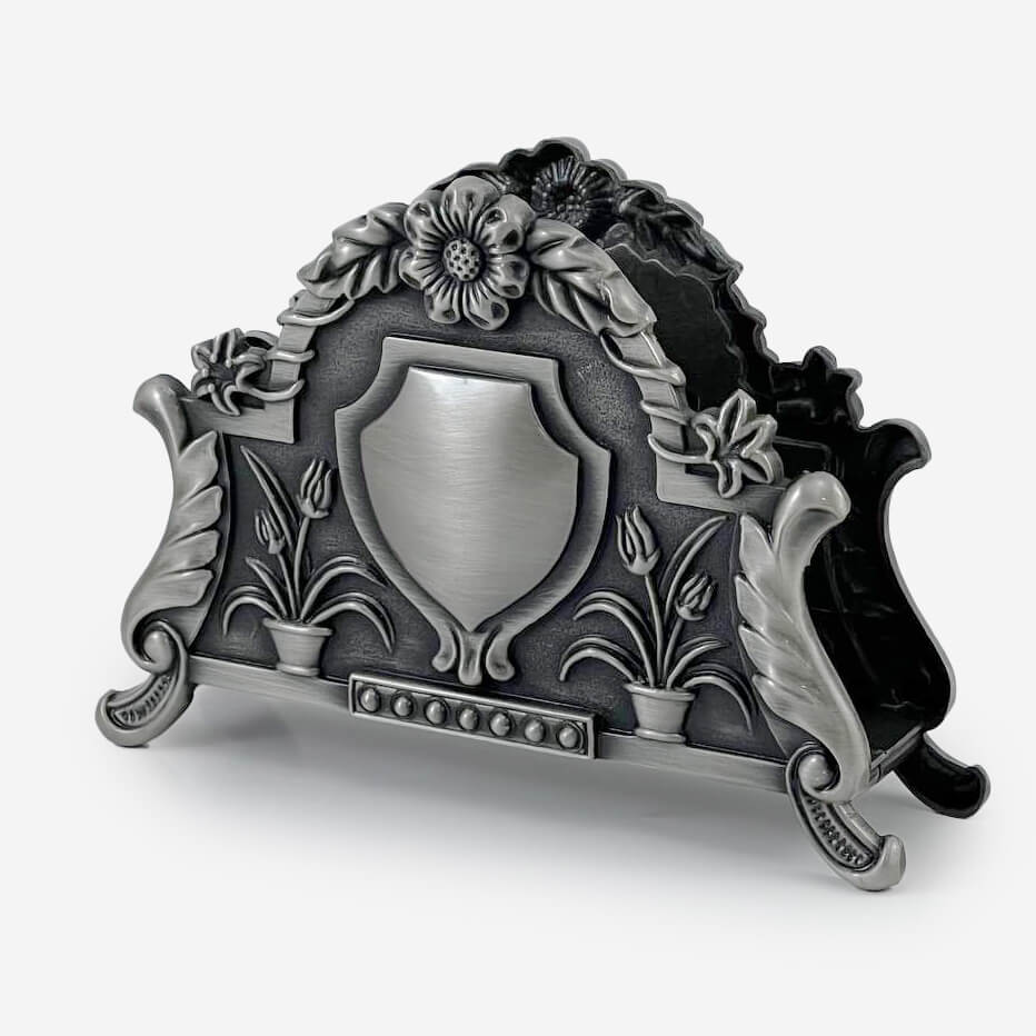 برای کسانی که به زیبایی و دکوراسیون منزل و پذیرایی میهمانان خود اهمیت میدهند و جود یک جا دستمالی زیبا بر روی میز پذیرایی آشکار است. جادستمالی کتابی پیوتر یونیک کد 1624 ساخته شده از فلز پیوتر و دارای نقش ها و طرح های متنوع است. این فلز که با نام مسوار هم شناخته می شود آلیاژی است از مس و قلع در رنگهای طلایی و خاکستری.