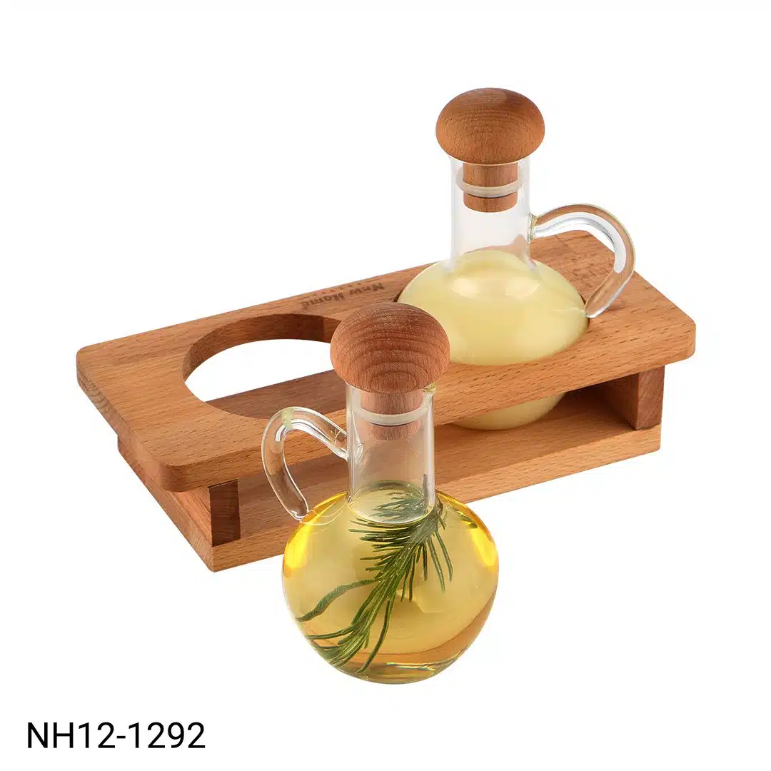 این ست شامل دو بطری شیشهای با طراحی منحصر به فرد است که به زیبایی بر روی یک پایهی چوبی قرار گرفتهاند. این ترکیب هماهنگ، آن را به گزینهای ایدهآل برای استفاده در میز غذاخوری، پذیرایی در مهمانیها و یا استفاده روزمره در آشپزخانه تبدیل کرده است.
