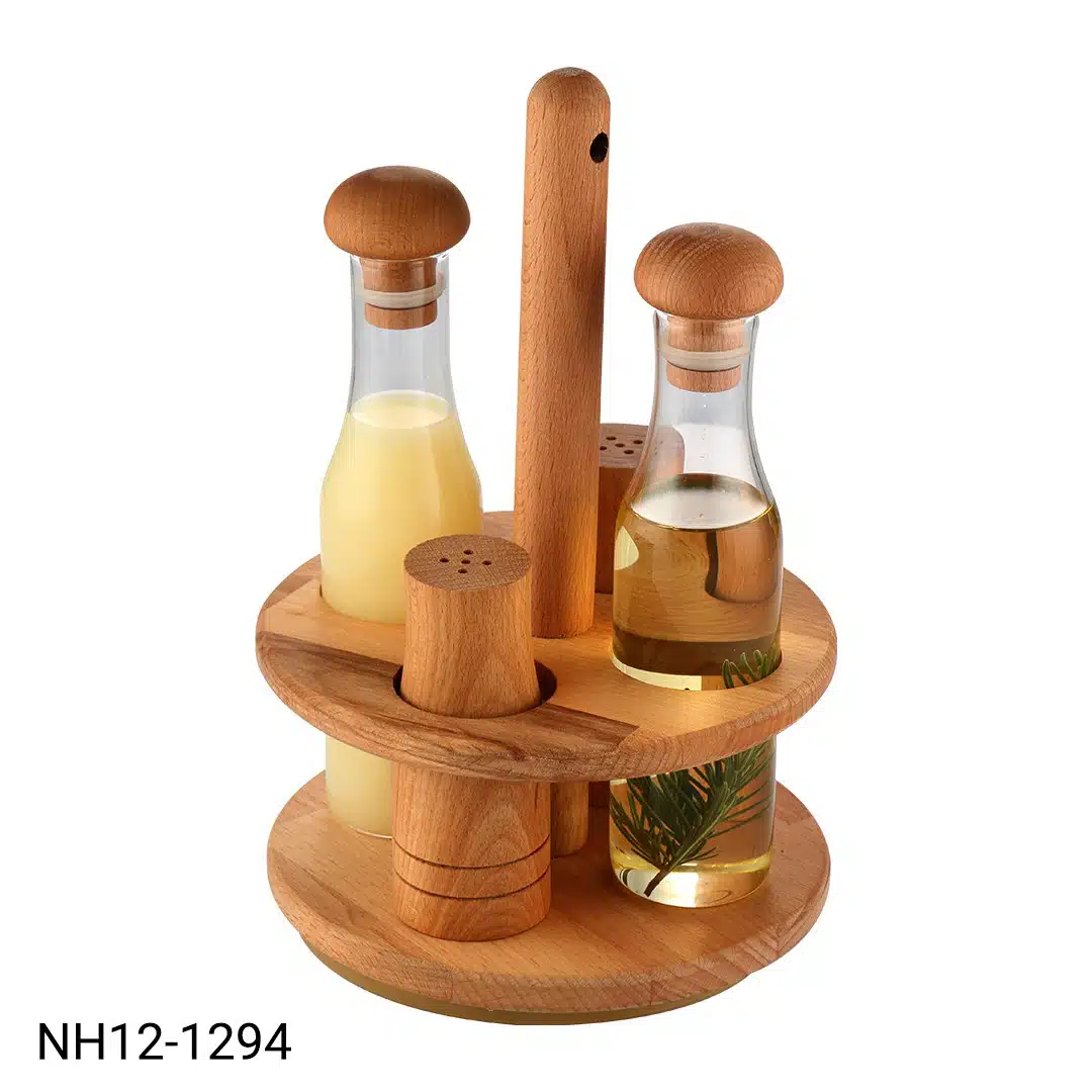 - ست کامل: شامل ۲ بطری شیشهای، ۲ نمکدان چوبی و پایه گردان.