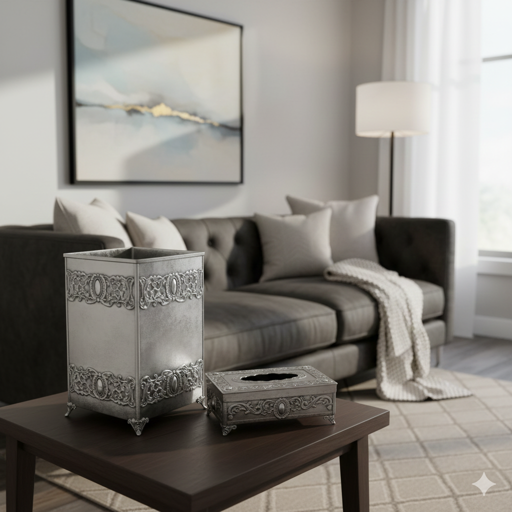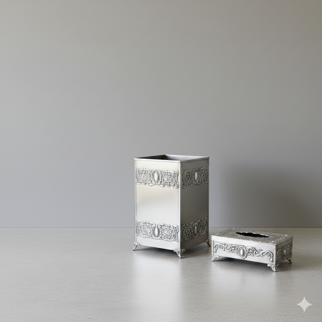 برای کسانی که به زیبایی و دکوراسیون منزل و پذیرایی میهمانان خود اهمیت میدهند و جود یک جا دستمالی زیبا بر روی میز پذیرایی آشکار است. “ست سطل و جا دستمالی پیوتر یونیک کد 1402” شامل یک جای دستمال کاغذی و سطل بدون در از جنس پیوتر است. این دو محصول از جنس آلیاژ پیوتر ساخته شده و روی آن ها با از نقوش برجسته تریین شده است. این طرح ها باعث شده تا این محصولات در طی سال ها زیبایی خود را حفظ کرده و قابل استفاده باشند. همچنین میتوانید از این محصول در کنار دیگر محصولات پیوتر برند یونیک استفاده کنید.