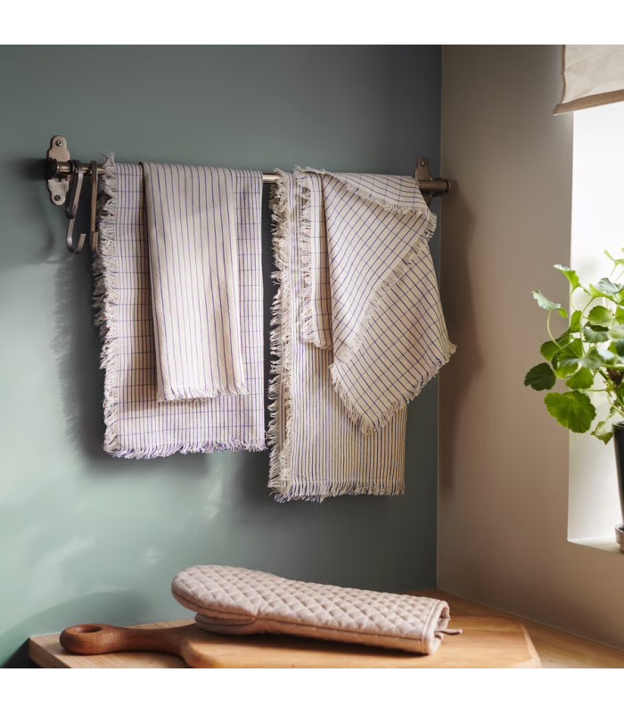 VÄLVÅRDAD با ابعاد مناسب ۴۵×۶۰ سانتیمتر، فضای کافی برای کاربردهای مختلف فراهم میآورند. طرحهای راهراه و چهارخانه به همراه حاشیههای تزئینی ظریف، یک جلوهی کلاسیک و زمانمند به آشپزخانه شما میبخشند.