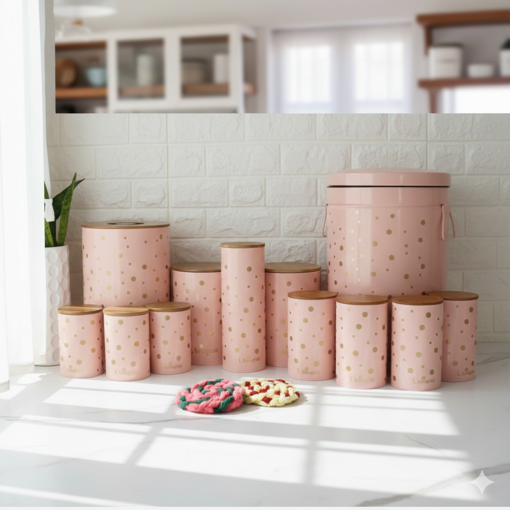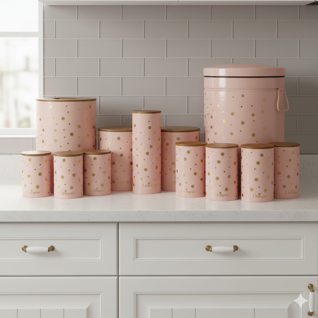 سرویس آشپزخانه 12 پارچه فانتزی مدل خالدار صورتی یونیک 8043 با درب بامبو