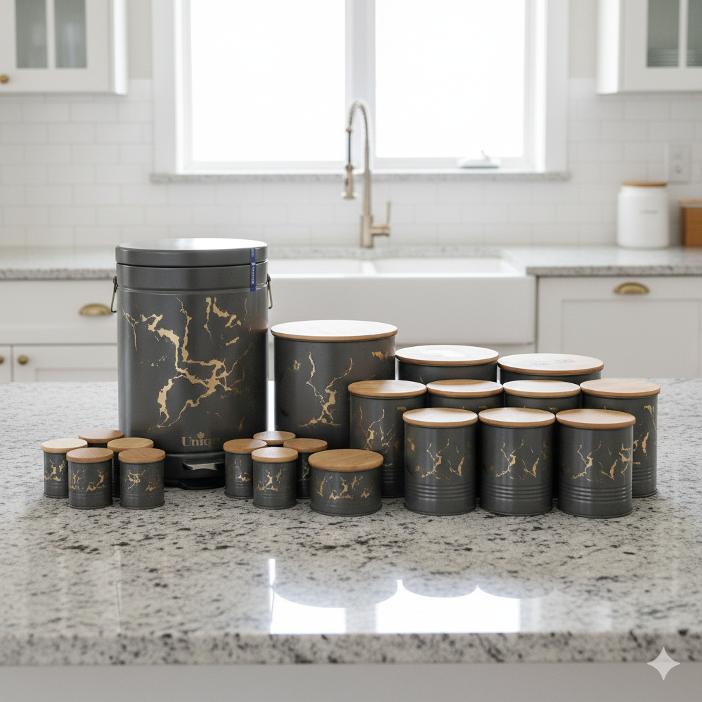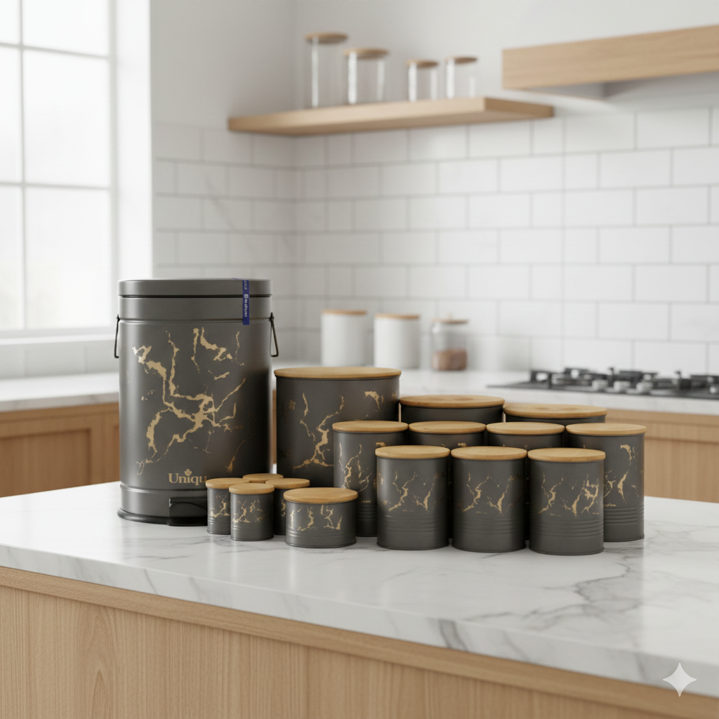 خرید سرویس های آشپزخانه راحت ترین راه برای تامین ظرف های آشپزخانه است. سرویس آشپزخانه 16پارچه یونیک الیزابت ماربل9012 طوسی شامل قوطی های فلزی بسیار با کیفیتی است که در اندازه های مختلف تولید شده اند. میتوانید از این قوطی ها برای نگهداری مواد غذایی مختلف استفاده کنید. برای مثال حبوبات، نمک، برنج، قند و شکر، ادویه جات و … . همچنین این سرویس دارای یک سطل زباله بزرگ است. این سطل هم از یک بدنه فلزی و یک سطل داخلی قابل جدا شدن از جنس پلاستیک تشکیل شده تا شستشو ی آن آسان باشد. سطل داخلی دارای یک دسته استیل است و به راحتی بیرون می آید. برای باز کردن درب این سطل یک پدال در نظر گرفته شده و درب آن به صورت آرام بسته میشود.