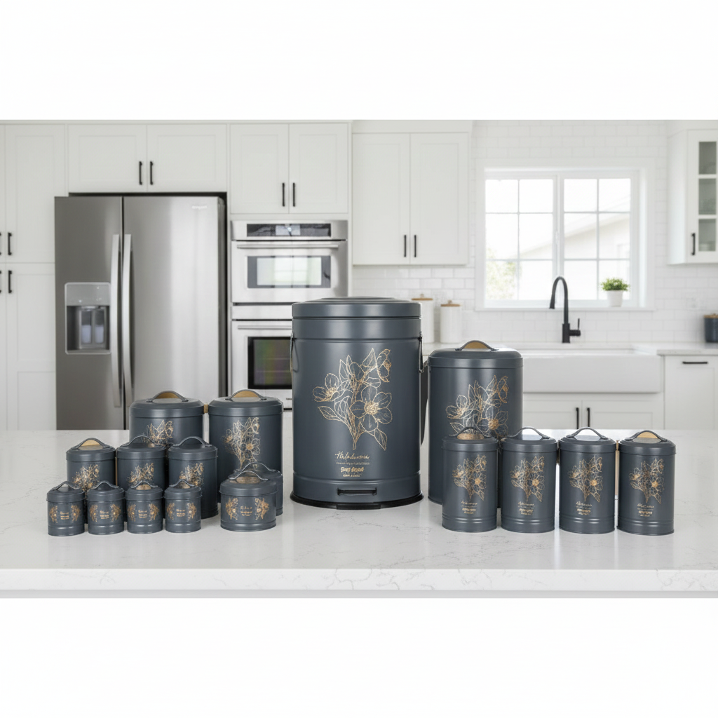 “سرویس آشپزخانه 17 پارچه نیوهوم مدل لوتوس کد NH13-1304-GR” یک سرویس آشپزخانه کامل برای خانه شماست. شاید انتخاب تک تک بانکه ها و سطل ها کار دشواری باشد و در نهایت ست آشپزخانه شما با هم جور نشود به این خاطر ترکیب بانکه ها و جا ادویه ها در یک پک، کار شما را راحت تر میکند. اما با خرید ست 17 پارچه نیوهوم نیاز بر طرف میشود. این محصول ساخته شده از فلز آبکاری شده با کیفیت است که دارای طرح و رنگبندی متنوع دارد ، همچنین محفظه داخلی بانکه کیفیت خوبی دارند و از بو گرفتن و خراب شدن مواد غذایی جلوگیری میکند. این سرویس شامل اقلام زیر میباشند: