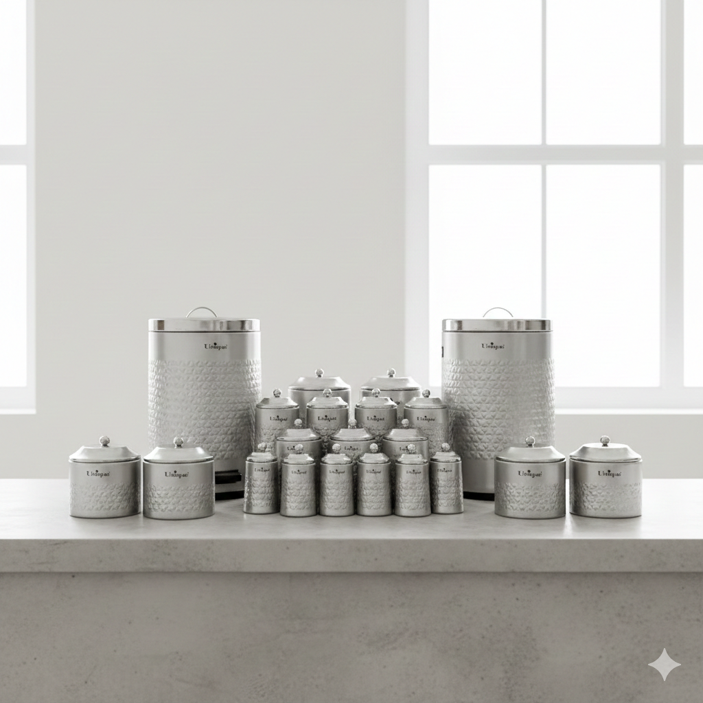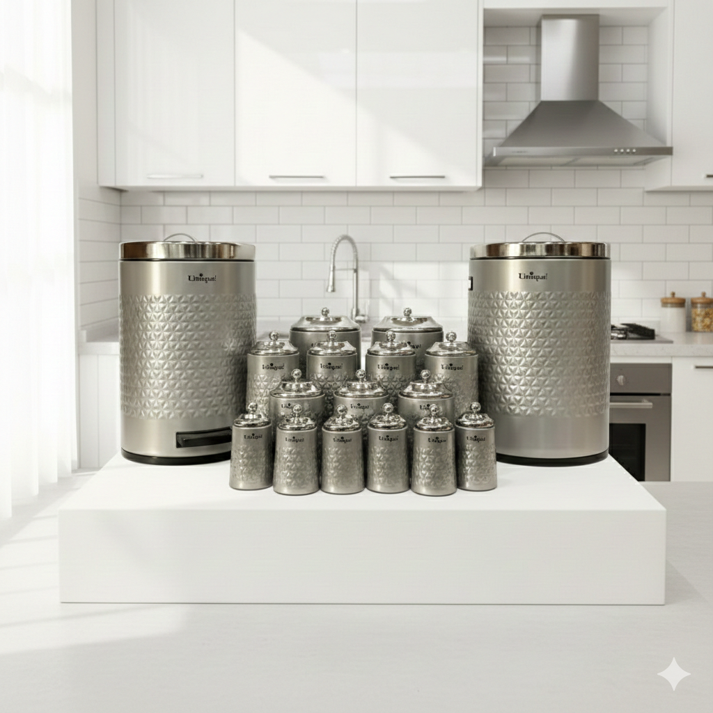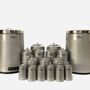 “سرویس آشپزخانه 17 پارچه گلکسی نقره ای استیل یونیک 4619 ” زمینه نقره ای شامل قوطی های بسیار با کیفیتی است که در اندازه های مختلف تولید شده اند. میتوانید از این قوطی ها برای نگهداری مواد غذایی مختلف استفاده کنید. برای مثال حبوبات، نمک، برنج، قند و شکر، ادویه جات و … . همچنین این سرویس دارای یک سطل زباله بزرگ است. این سطل هم از یک بدنه فلزی و یک سطل داخلی قابل جدا شدن از جنس پلاستیک تشکیل شده تا شستشو ی آن آسان باشد. سطل داخلی دارای یک دسته استیل است و به راحتی بیرون می آید. برای باز کردن درب این سطل یک پدال در نظر گرفته شده و درب آن به صورت آرام بسته میشود. این محصول شامل: