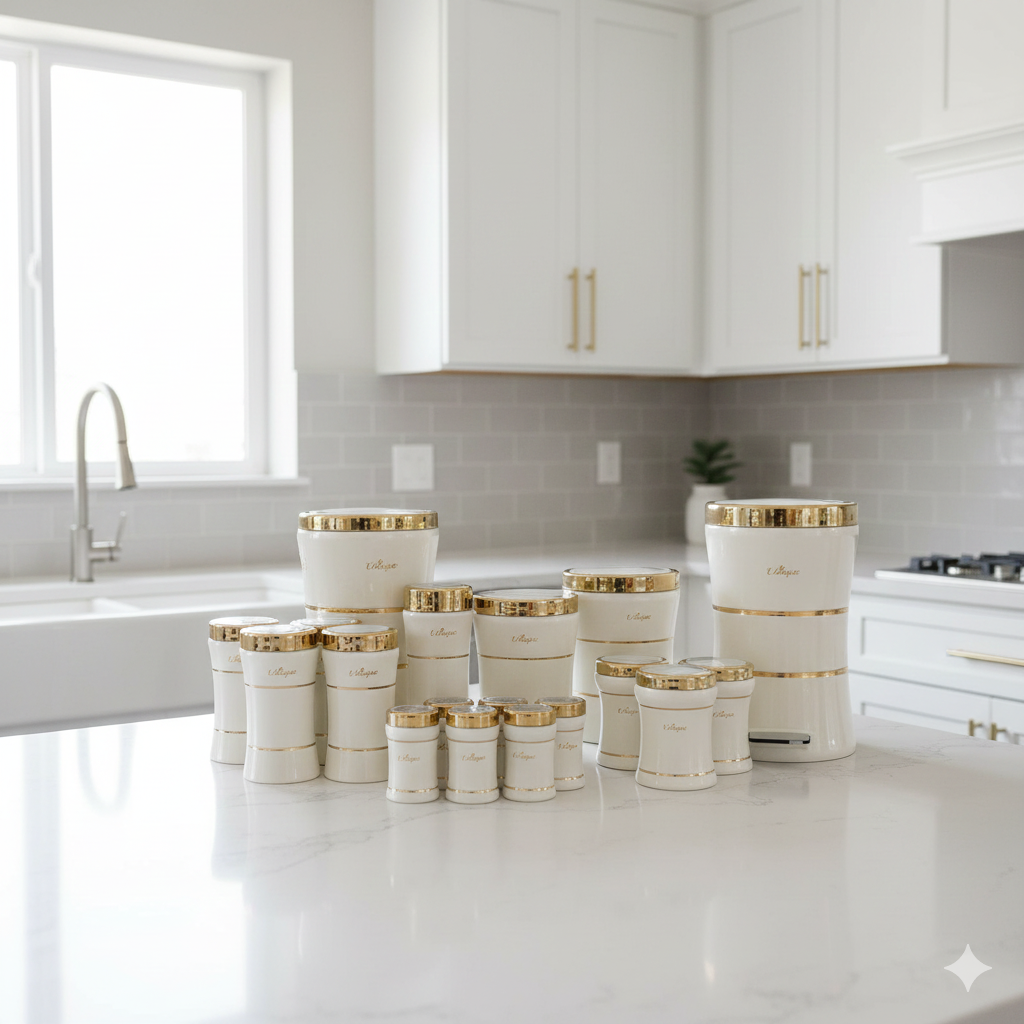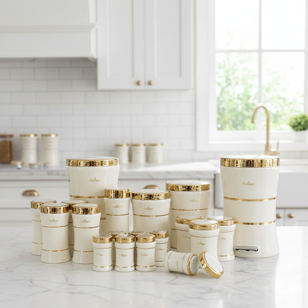 سرویس آشپزخانه 18 پارچه کمر باریک کرم طلایی یونیک 4599