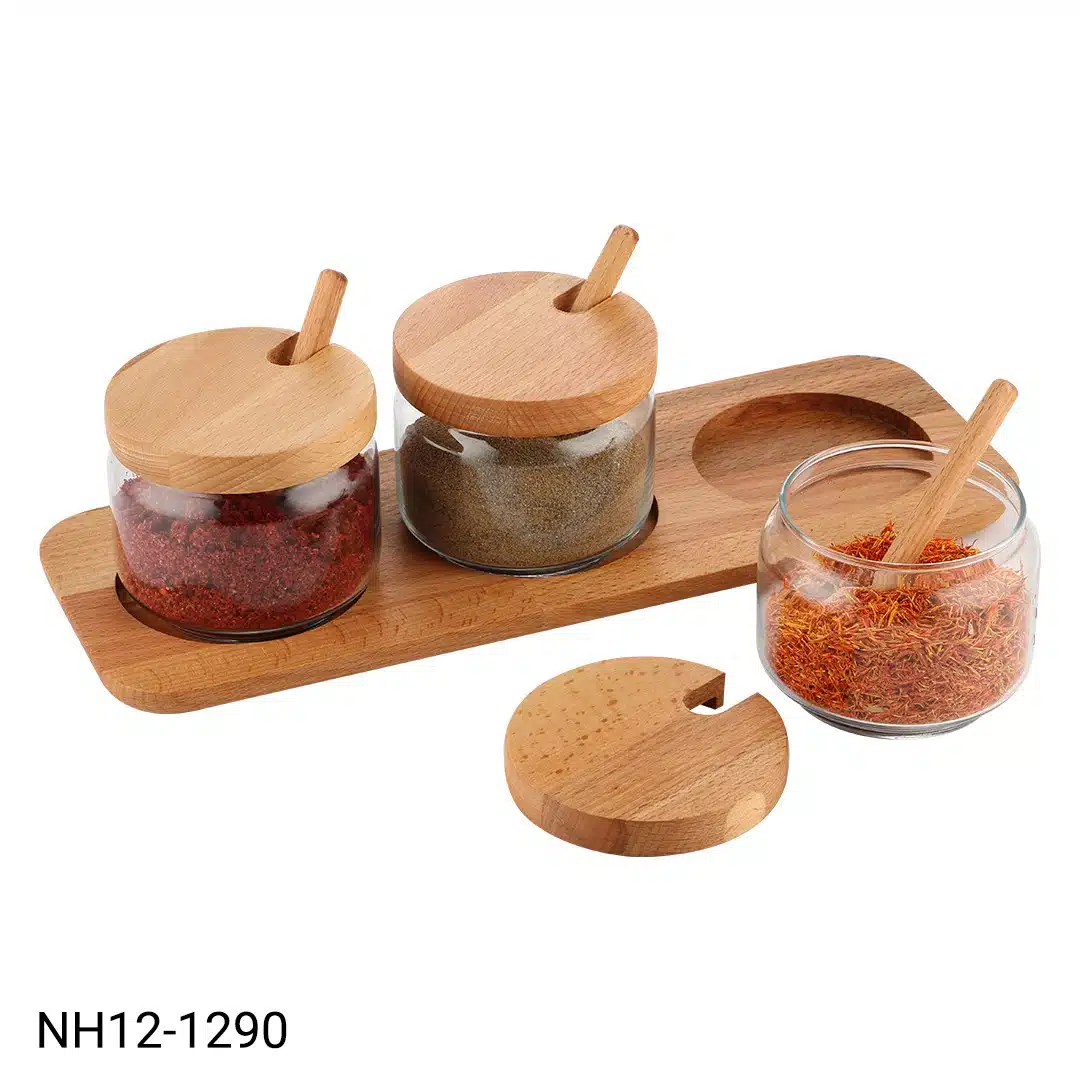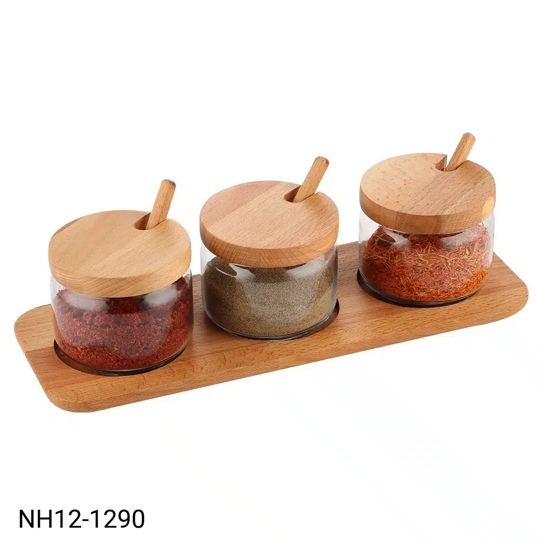 - ست دو عددی: شامل سه شیشه شفاف با درب و قاشق چوبی.