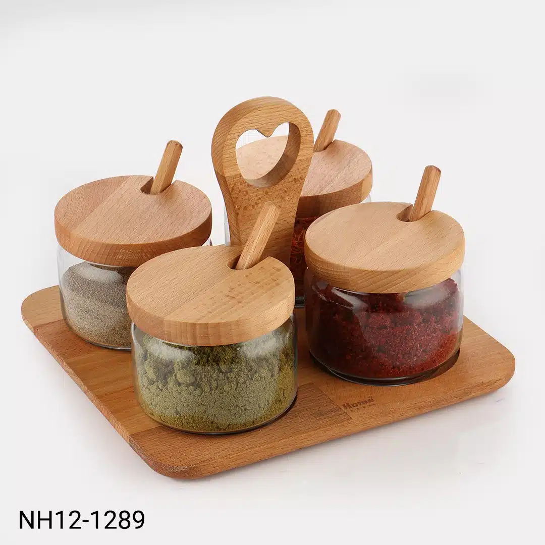 - ست دو عددی: شامل چهار شیشه شفاف با درب و قاشق چوبی.