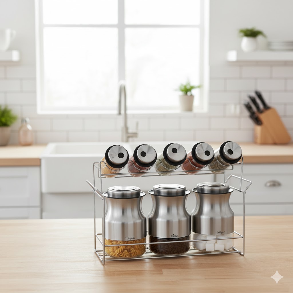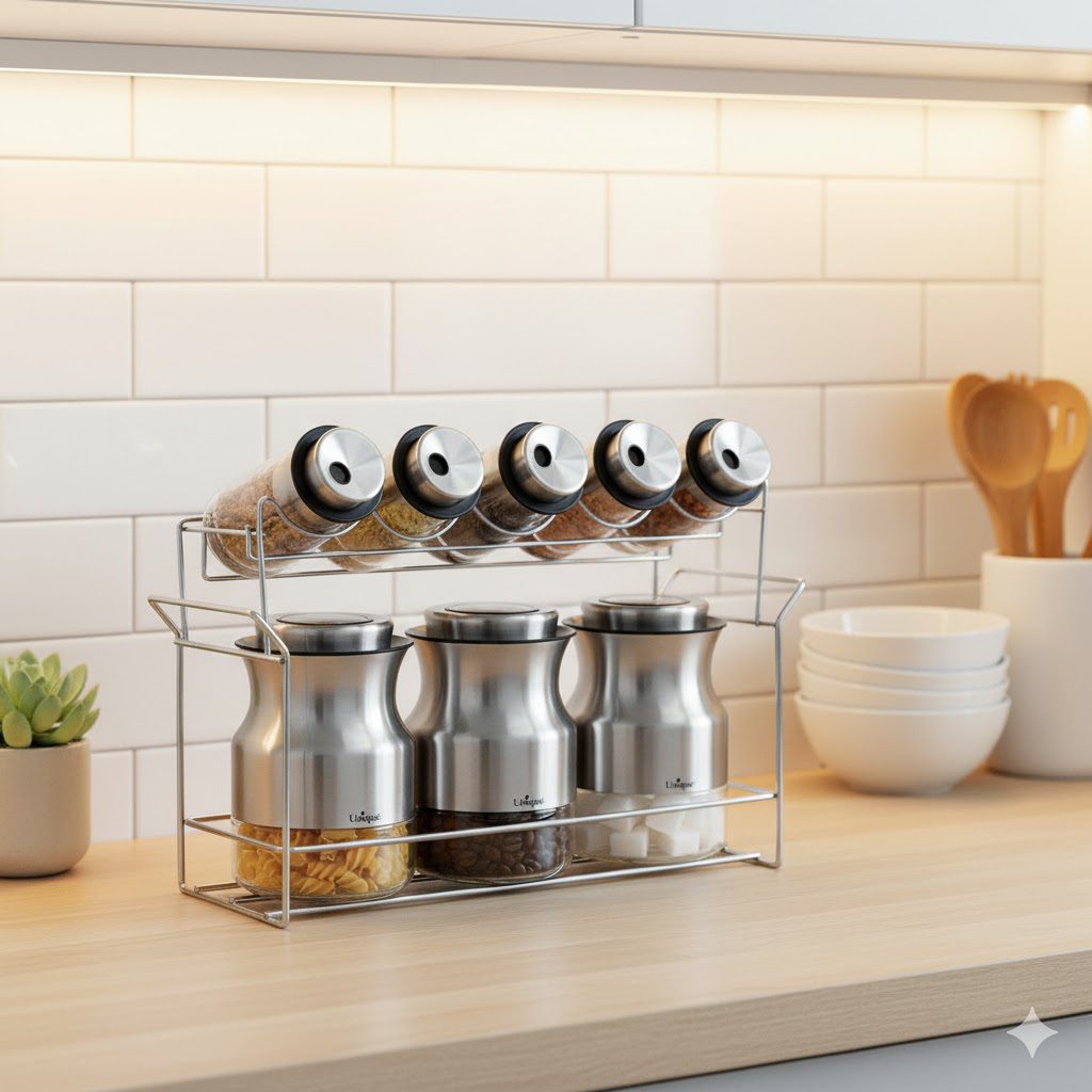 یک پایه استیل برای نگهداری این ظروف در دو طبقه