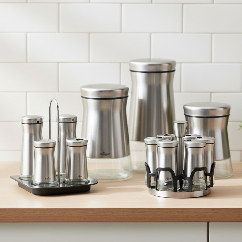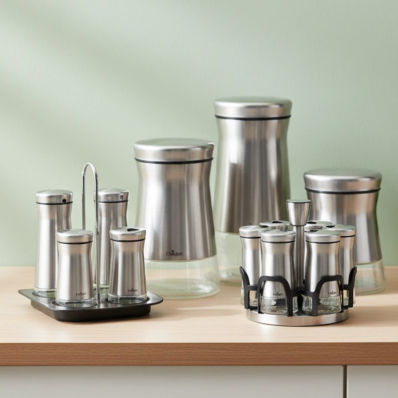سرویس بانکه 16 پارچه عروس نقره ای یونیک کد 1405 (خارجی درجه1) مجموعه ای از ظروف نگهدارنده مورد نیاز آشپزخانه برای نگهداری مواد غذایی است. این ست ظروفی برای نگهداری ادویه جات، نمک و فلفل، روغن و آبلیمو و به طور کلی چاشنی های مایع و ظروفی بزرگتر برای نگهداری حبوبات یا پاستا و ماکارونی دارد. جنس این ظروف از استیل رنگ شده با رنگ کوره ای و بادوام است.
