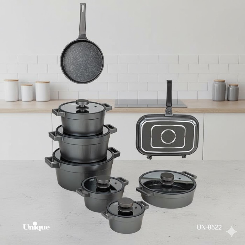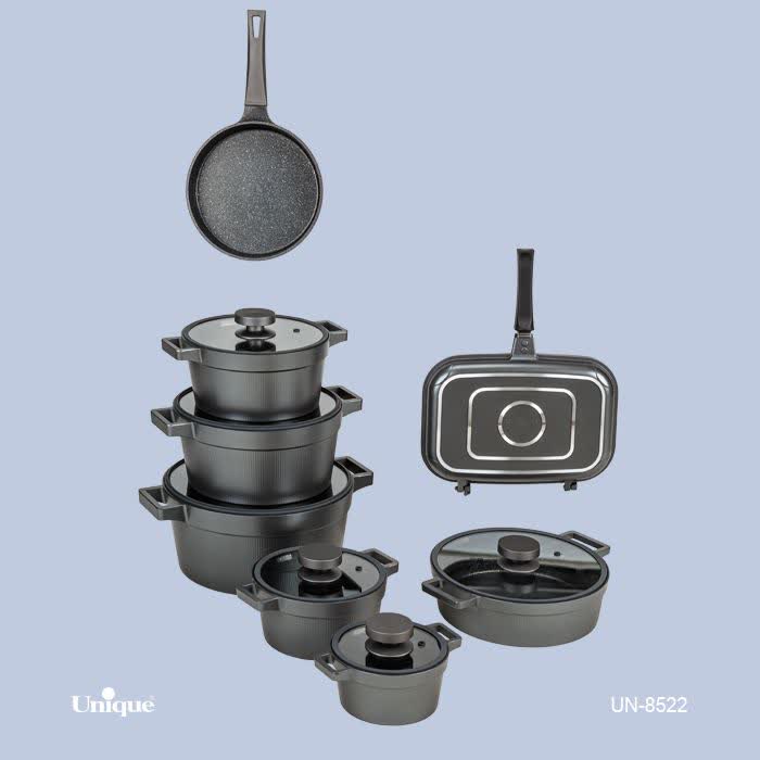 به طور خلاصه، این مجموعه ظروف آشپزخانه “Unique” با طراحی کاربردی، پوشش نچسب، دربهای شیشهای شفاف، و ظاهر مدرن، میتواند انتخابی مناسب برای آشپزخانههای امروزی باشد که هم به کارایی و هم به زیبایی اهمیت میدهند. این ست، طیف وسیعی از نیازهای پخت و پز روزمره را پوشش میدهد.