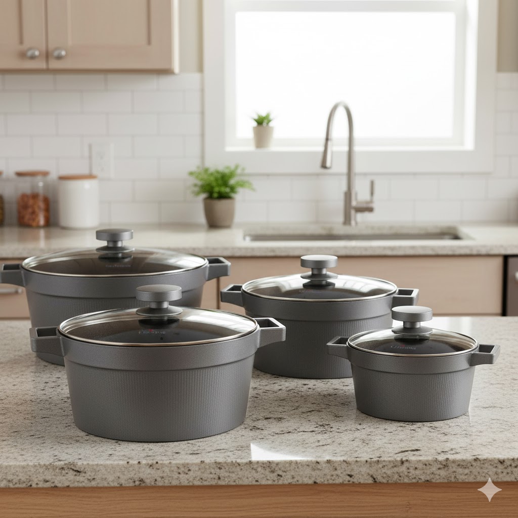 - رنگ خاکستری دودی شیک و مات: بدنهی این قابلمهها با رنگ خاکستری دودی (تیره) مات و پرداخت شده، ظاهری بسیار لوکس و امروزی دارد. این رنگ نه تنها به راحتی با هر دکوراسیون آشپزخانهای ست میشود، بلکه مقاومت بالایی در برابر لکه و اثر انگشت دارد. خطوط عمودی ظریفی که بر روی بدنهی قابلمهها نقش بسته، علاوه بر زیبایی، به استحکام بیشتر و پخش یکنواختتر حرارت کمک میکند.