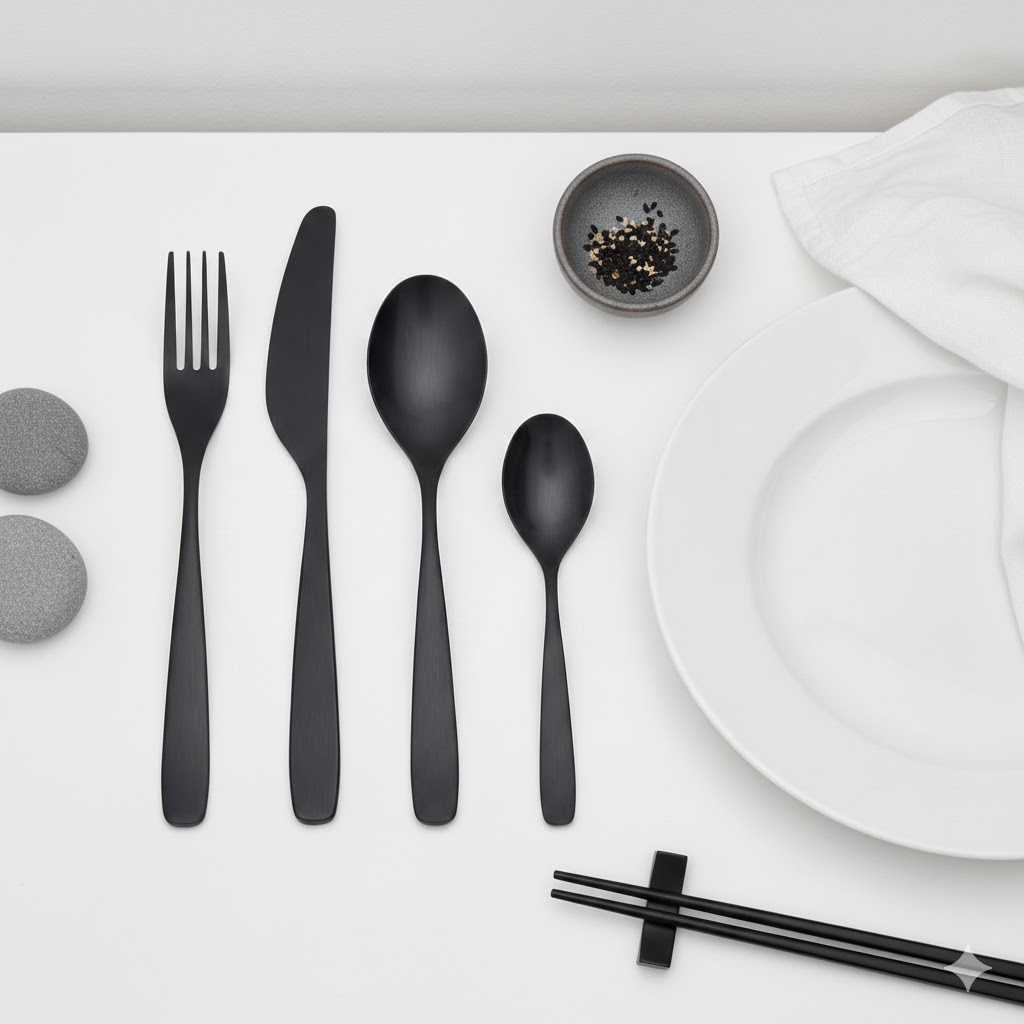 یک سرویس قاشق و چنگال 6 نفره با طرح مدرن و رنگ مشکی. سرویس قاشق چنگال مشکی ایکیا IKEA-TILLAGD شامل 24 عدد ابزار پذیرایی است. این سرویس از جنس استیل ضد زنگ است متالایز به رنگ مشکی براق است و قابلیت شستشو در ماشین ظرفشویی را دارند.