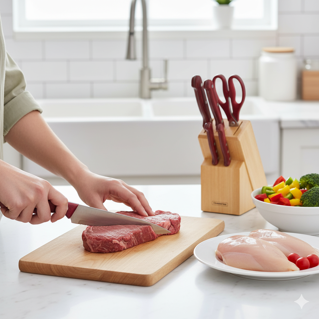 این چاقو ها را در 5 اندازه تولید شده اند. تیغه آن ها به صورت یک تکه از استیل ضد زنگ با کیفیت بالا ساخته شده است. دسته ها از جنس پلی پروپیلن هستند که با اتصالات فلزی به دسته محک شده اند. به همین دلیل طول عمر و استحام بسیار بالایی دارند. از این چاقو ها میتوان برای برش نان، گوشت، سبزیجات و … استفاده کرد. امکان شستشوی این چاقو ها در ماشین ظرفشویی وجود دارد. بهتر است پس از شستشو و قبل از قرار دادن چاقو ها در پایه چوبی، آن ها را خشک کنید.