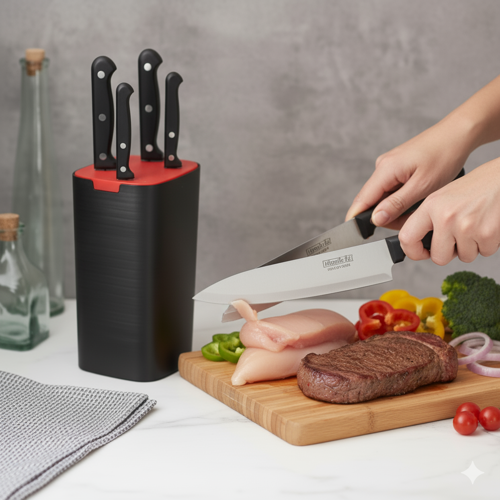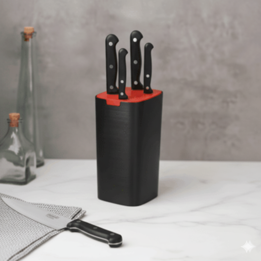 این چاقو ها را در 5 اندازه و شکل مختلف تولید شده اند. تیغه آن ها به صورت یک تکه از استیل ضد زنگ با کیفیت بالا ساخته شده است. دسته ها از جنس پلی پروپیلن هستند که با اتصالات فلزی به دسته محک شده اند. به همین دلیل طول عمر و استحام بسیار بالایی دارند. از این چاقو ها میتوان برای برش نان، گوشت، سبزیجات و … استفاده کرد. امکان شستشوی این چاقو ها در ماشین ظرفشویی وجود دارد. بهتر است پس از شستشو و قبل از قرار دادن چاقو ها در پایه چوبی، آن ها را خشک کنید.