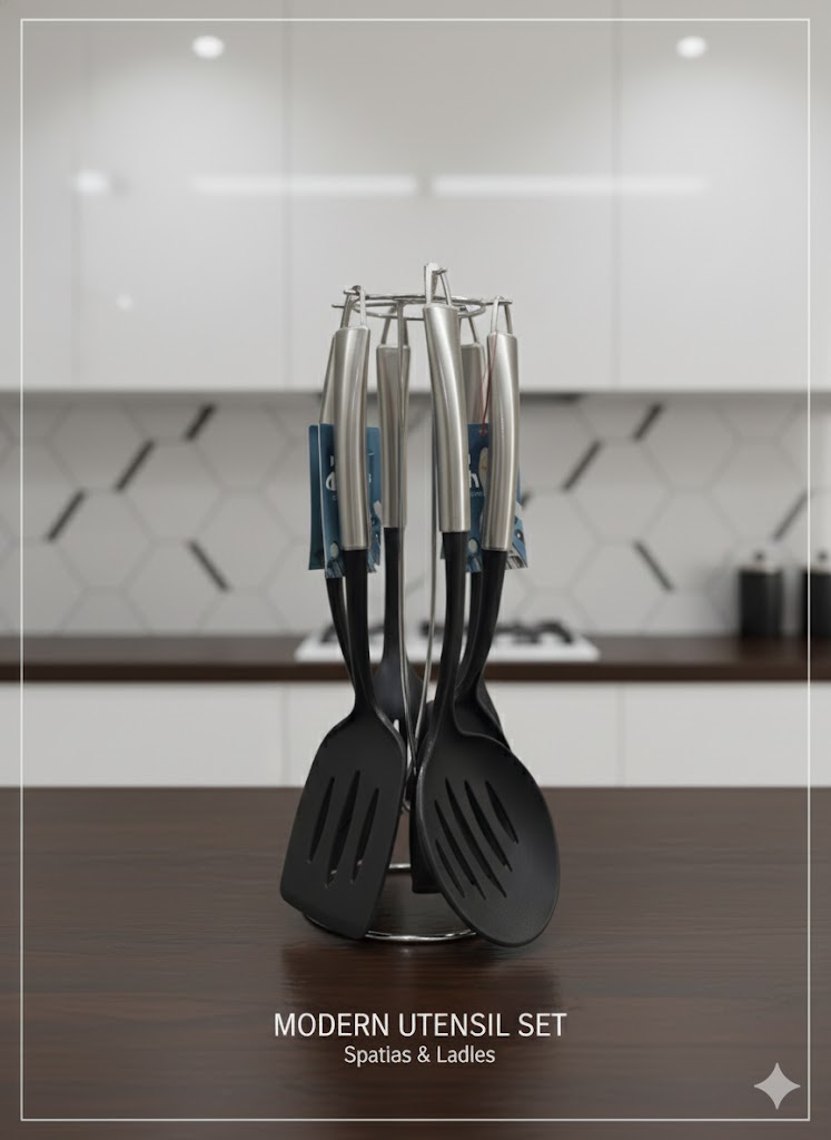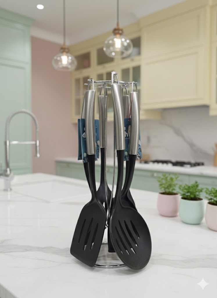 اولین چیزی که در این ست خودنمایی میکند، طراحی چشمنواز و مدرن آن است. ترکیب خیرهکننده استیل براق و نقرهای رنگ در دستهها با قسمتهای کاربردی مشکی مات، کنتراستی زیبا و هماهنگ ایجاد کرده که به راحتی با هر سبک دکوراسیون آشپزخانه، از کلاسیک تا مینیمال، ست میشود. پایه نگهدارنده نیز از جنس استیل صیقلی است که درخششی خاص به محیط میبخشد و ابزارها را به صورت منظم و شیک، عمودی نگه میدارد. این ست، تنها یک ابزار آشپزی نیست؛ یک قطعه دکوراتیو است که بر روی پیشخوان شما میدرخشد.
