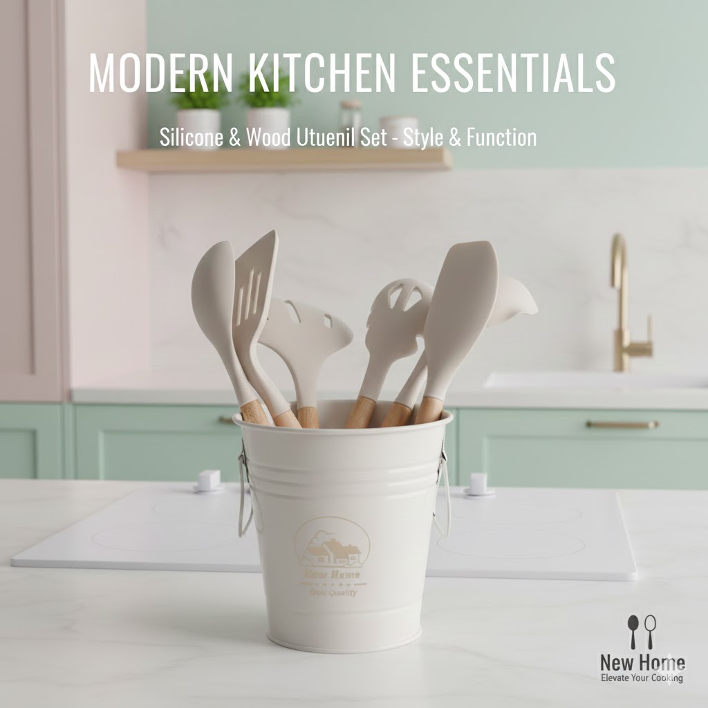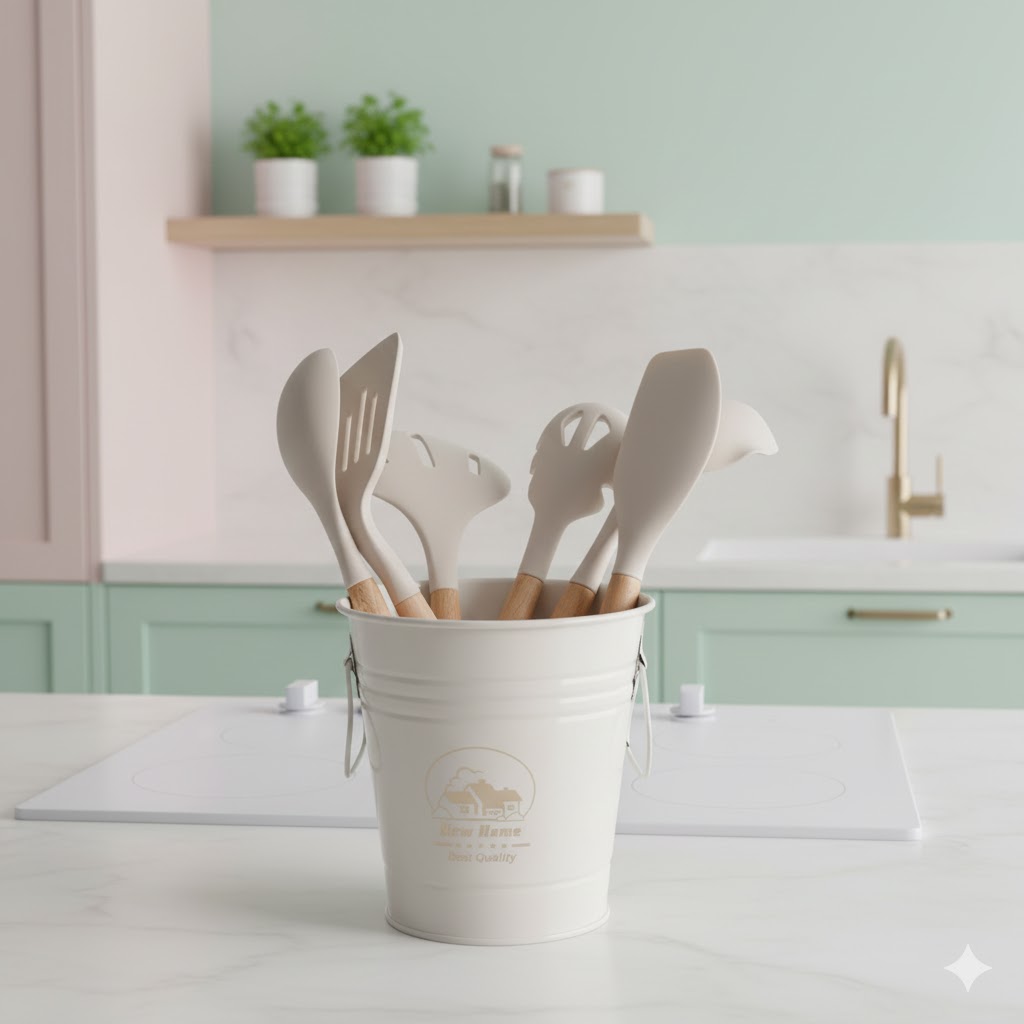 سرویس کفگیر و ملاقه 7پارچه مدل سیلیکونی سطل فلزی نیوهوم کد 1501