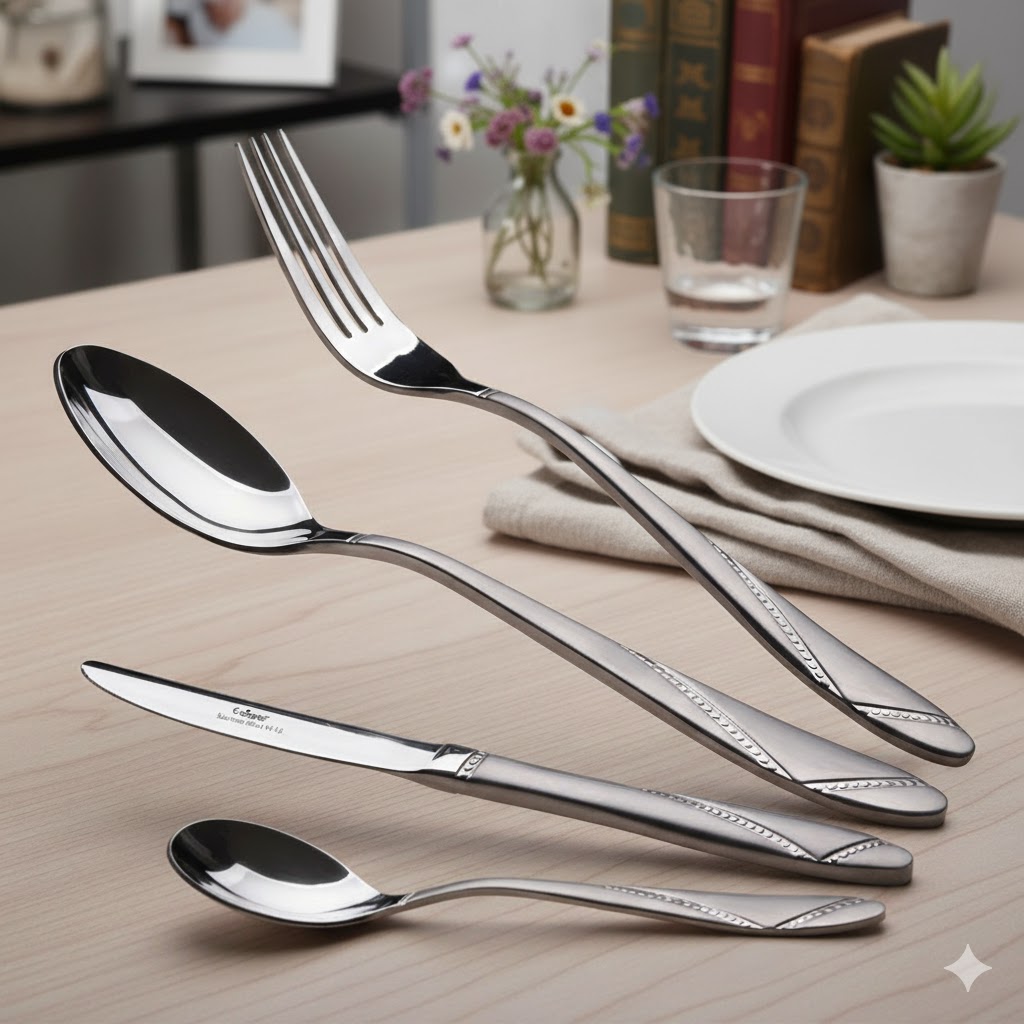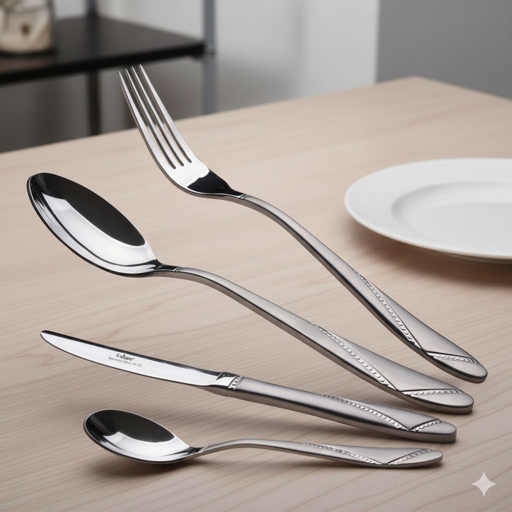 انتخاب قاشق و چنگال غذا خوری تکمیل کننده یک سفره زیبا است. تنوع رنگ و طرح بسیار زیاد قاشق و چنگال ها دست شما را برای انتخاب یک ست مناسب برای میز غذای شما باز میگذارد.جدای از ظاهر زیبای قاشق و چنگال از مهمترین ویژگی های لازم که باید به آنها توجه کرد، جنس و استحکام فلز به کار رفته در قاشق و چنگال است. اگر از جنس مرغوبی در تهیه آن استفاده نشده باشد ممکن است هنگام استفاده خم شود یا به دلیل سنگینی بیش از حد دست شما و مهمانان عزیزتان خسته شود. بهترین جنس برای تولید یک قاشق یا چنگال استیل ضد زنگ 10/80 ایت. این فلز در برابر زنگ زدگی کاملا محفوظ است و تا سالهای سال سالم جزوی از وسایل غذا خوری شما باقی می ماند.