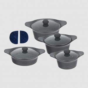 دسته های این سرویس به صورت یک تکه با بدنه قالب گیری شده اند. این ویژگی امکان استفاده از این قابلمه ها را درون فر میدهد(بدون درب).