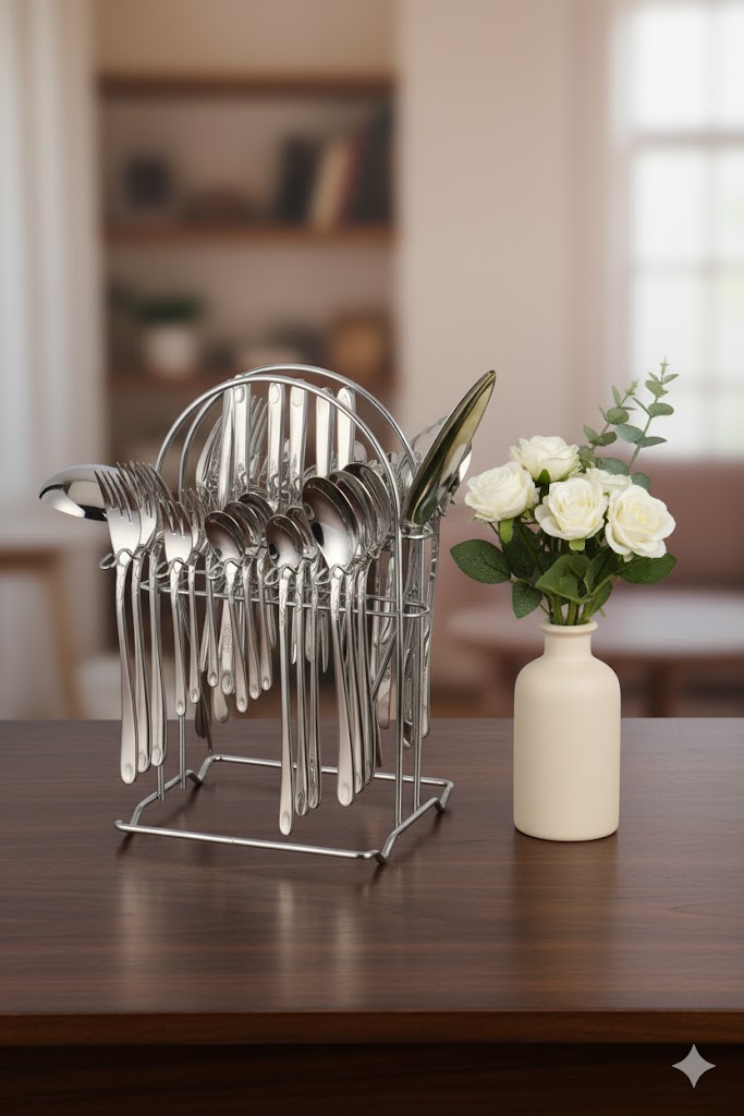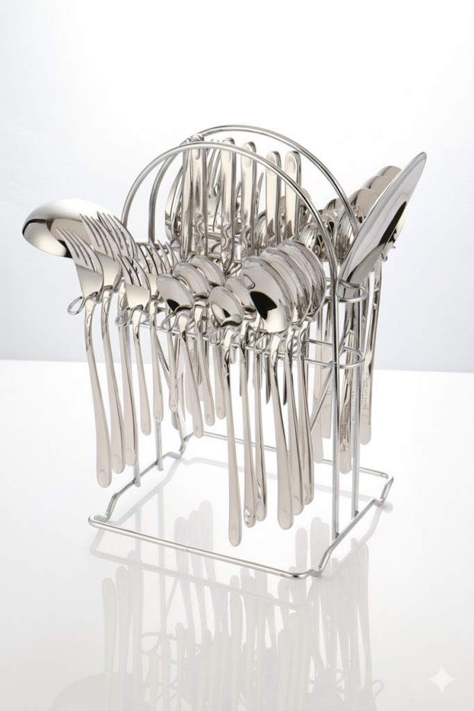 - شامل 39 قطعه: 6 عدد قاشق غذا خوری 6 عدد چنگال غذا خوری 6 عدد کارد میوه خوری 6 عدد چنگال میوه خوری 6 عدد قاشق چایی 6 عدد قاشق شربت و 1 عدد کفگیر و 1 عدد ملاقه و استند