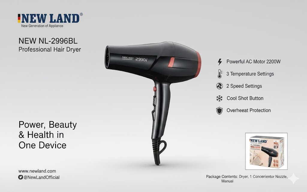 سشوار حرفه ای نیولندمدل NL-2996BL:رهایی از موهای خسته و بیحالت، با قدرت و ظرافت نیو لند NL-2996BL