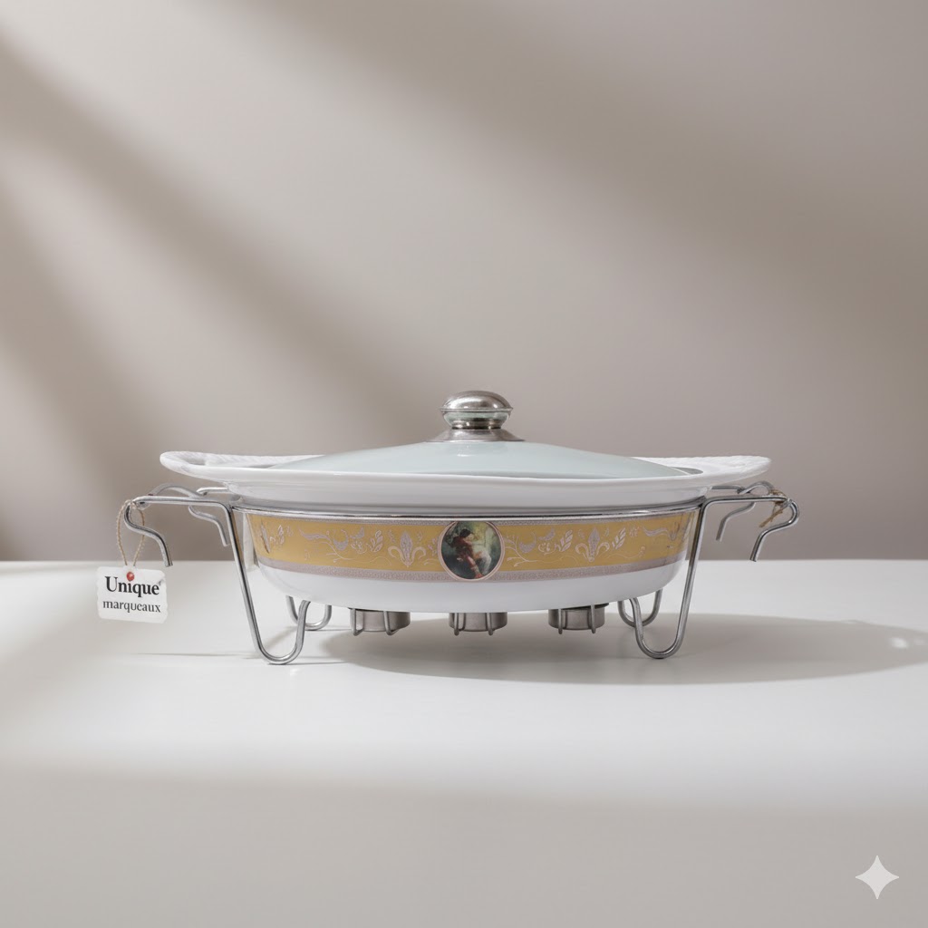 “سوفله خوری بیضی بزرگ مدل کلاسیک یونیک کد 8550” ساخته شده از دو قسمت مجزا است. ظرف پیرکس فرانسه داخلی برای قرار دادن غذا و بدنه و درب از جنس چینی 10-80 درجه یک. مناسب برای سرو انواع غذا به صورت سرد و گرم. زیر این ظرف دو جا شمعی تعبیه شده و گرمای کافی برای گرم نگه داشتن انواع غذا ها را تامین میکند.دسته های زیبای این محصول ظاهری بسیار لوکس و مناسب جشن ها و تشریفات خاص شما دارد.