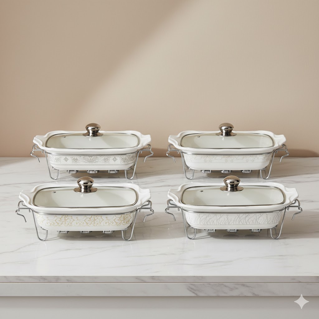 شامل یک ظرف پیرکس، یک درب و یک نگهدارنده استیل |