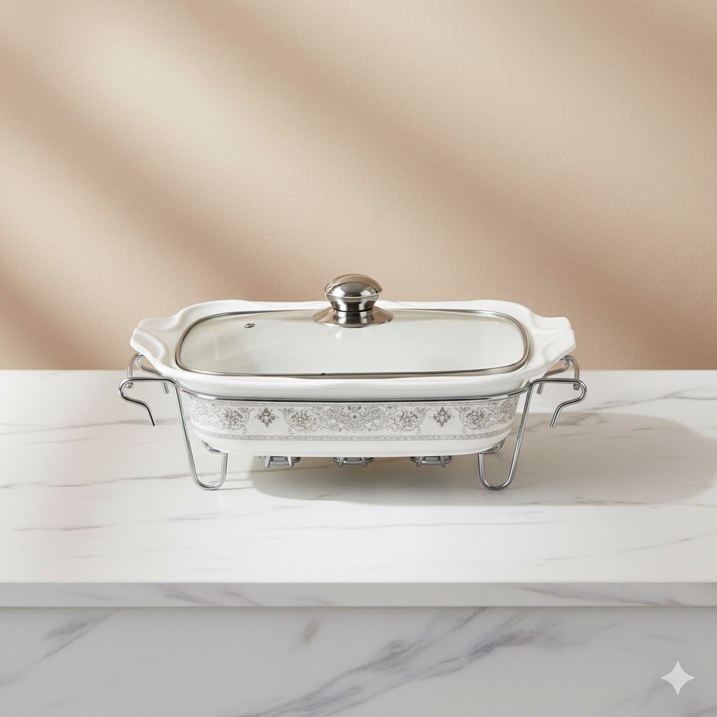 “سوفله خوری چینی بزرگ یونیک کد 8531” ساخته شده از سه قسمت مجزا است. ظرف از جنس چینی در داخل برای قرار دادن غذا. دستگیره درب و وارمر از جنس استیل ضد زنگ درجه یک. و درب شیشه ای. مناسب برای سرو انواع غذا به صورت سرد و گرم. زیر این ظرف دو جا شمعی تعبیه شده و گرمای کافی برای گرم نگه داشتن انواع غذا ها را تامین میکند. بدنه شیار دار و دسته های زیبای این محصول ظاهری بسیار زیبا و مناسب مهمانی ها یا استفاده روزمره دارد.