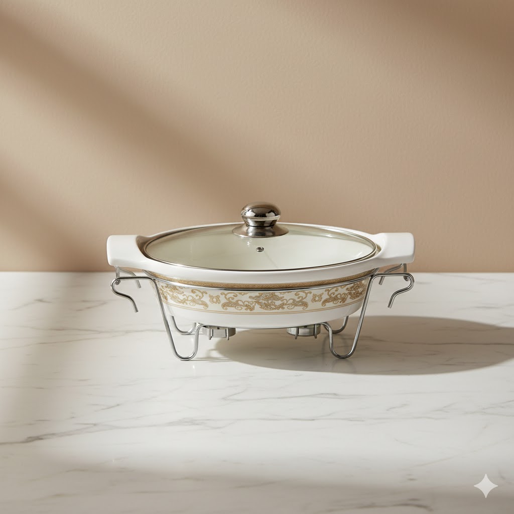 “سوفله خوری چینی بزرگ یونیک کد 8544” ساخته شده از سه قسمت مجزا است. ظرف از جنس چینی در داخل برای قرار دادن غذا. دستگیره درب و وارمر از جنس استیل ضد زنگ درجه یک. و درب شیشه ای. مناسب برای سرو انواع غذا به صورت سرد و گرم. زیر این ظرف دو جا شمعی تعبیه شده و گرمای کافی برای گرم نگه داشتن انواع غذا ها را تامین میکند. بدنه شیار دار و دسته های زیبای این محصول ظاهری بسیار زیبا و مناسب مهمانی ها یا استفاده روزمره دارد.