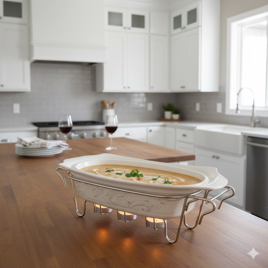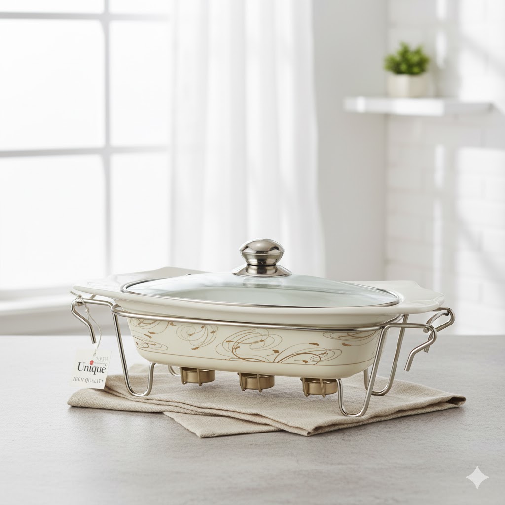 “سوفله مستطیل متوسط یونیک کد 8515” ساخته شده از دو قسمت مجزا است. ظرف پیرکس فرانسه داخلی برای قرار دادن غذا و بدنه و درب از جنس چینی 10-80 درجه یک. مناسب برای سرو انواع غذا به صورت سرد و گرم. زیر این ظرف دو جا شمعی تعبیه شده و گرمای کافی برای گرم نگه داشتن انواع غذا ها را تامین میکند.دسته های زیبای این محصول ظاهری بسیار لوکس و مناسب جشن ها و تشریفات خاص شما دارد.